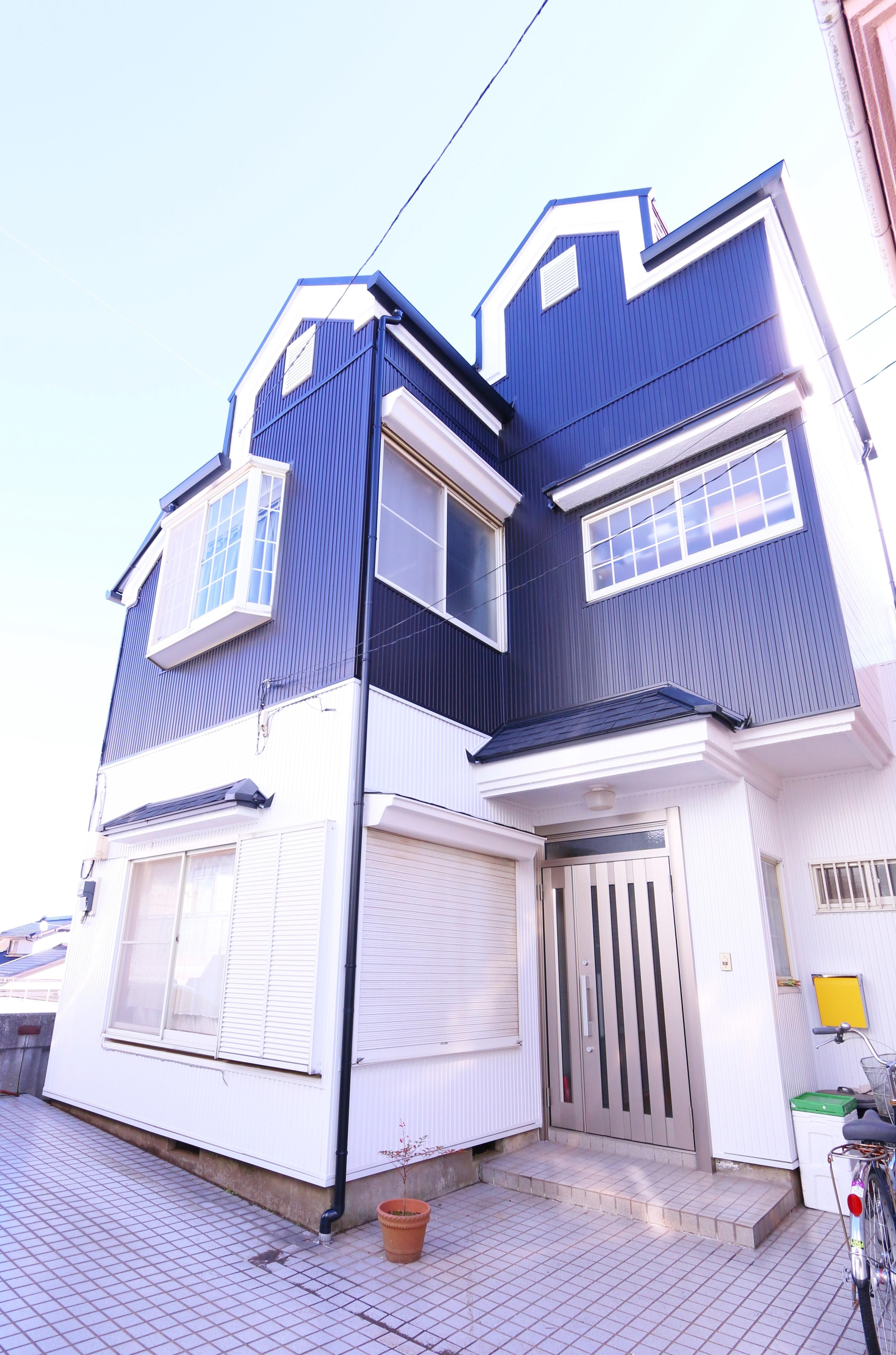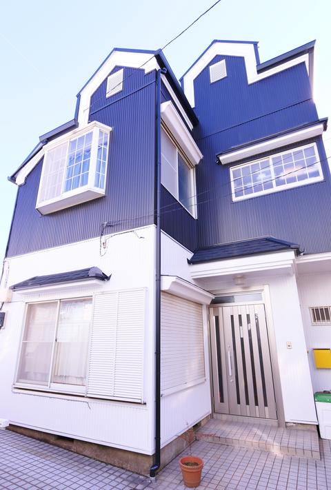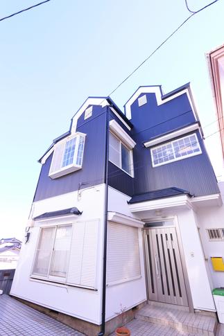 外壁塗装、玄関ドアのリフォームです。 青と白の塗装で爽やかな印象に仕上がっています。 玄関ドアはLIXILのリシェントです。