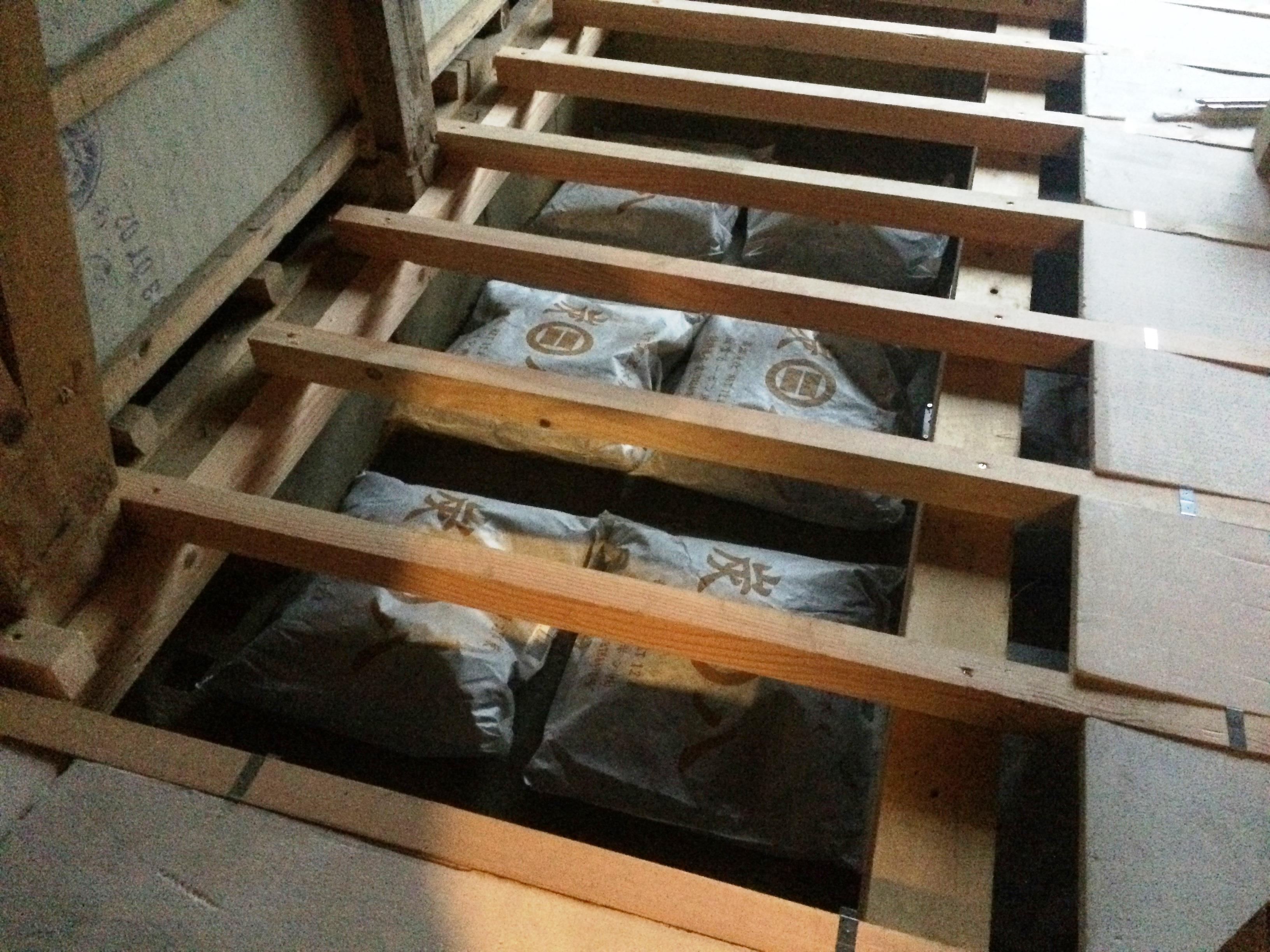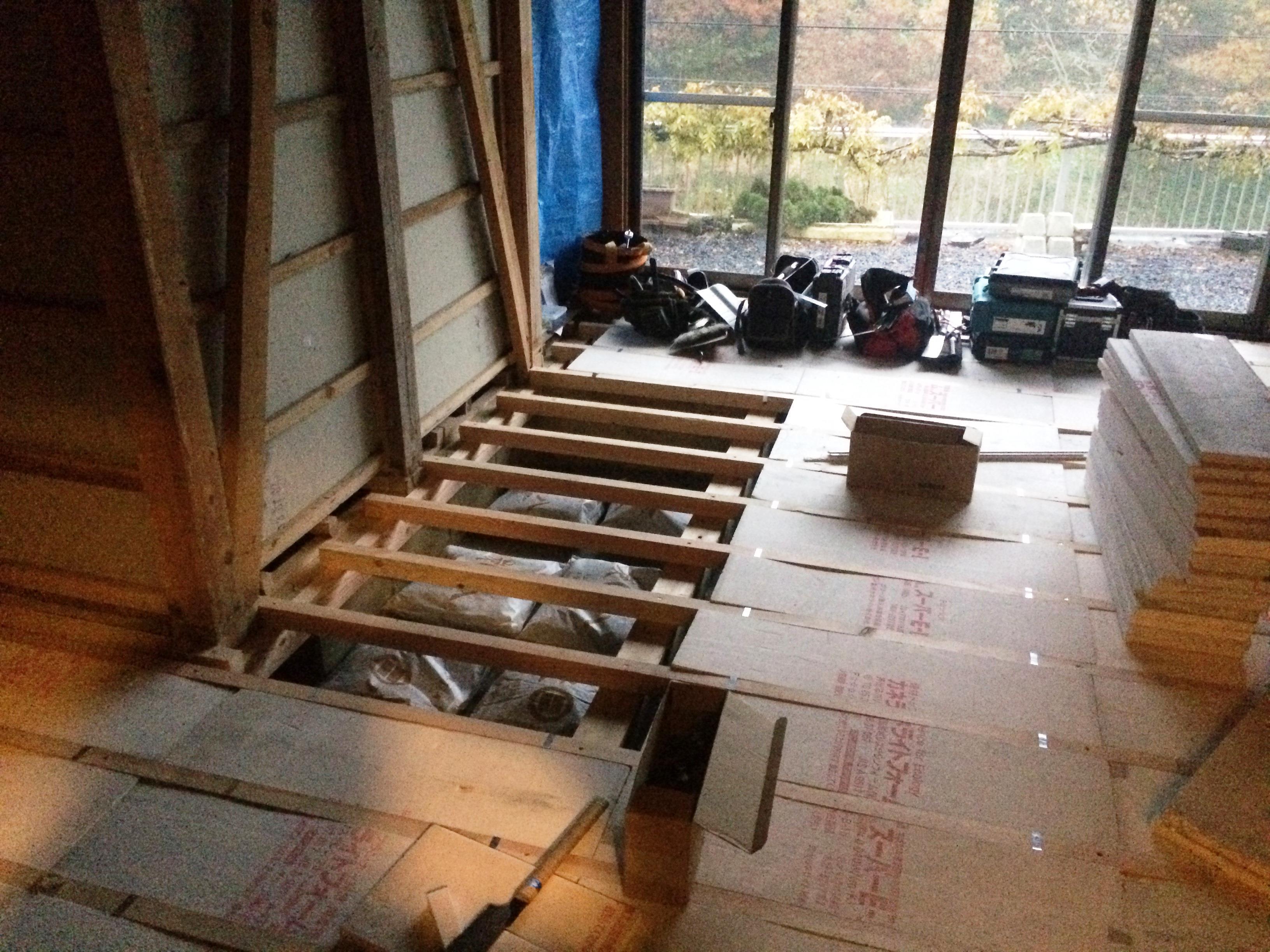 ↑床下にコンクリートをしてその上に炭八を敷きつけていきました。