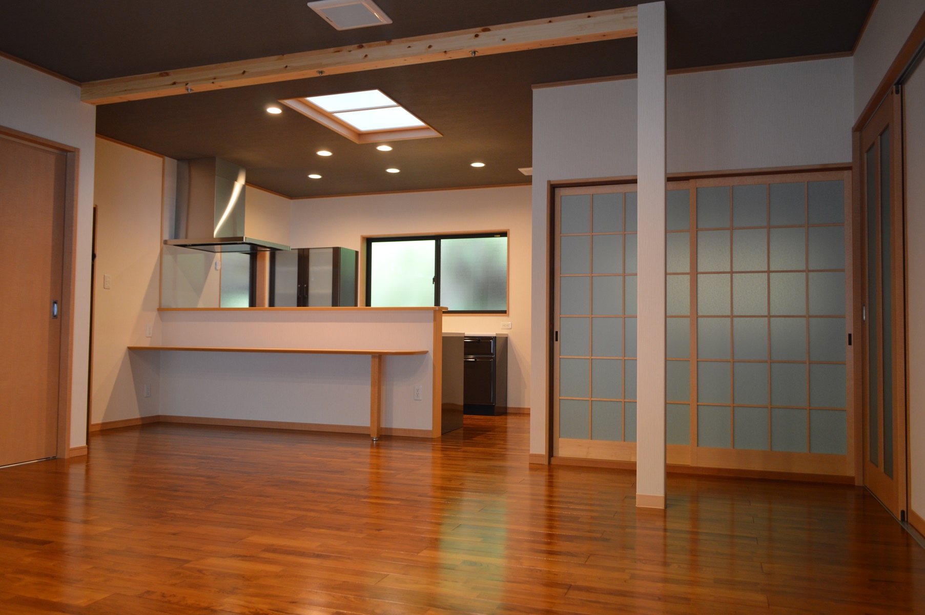 玄関周り、LDKの改修工事をしていきました。居間の壁をなくし、対面式のキッチンを施工していきました。