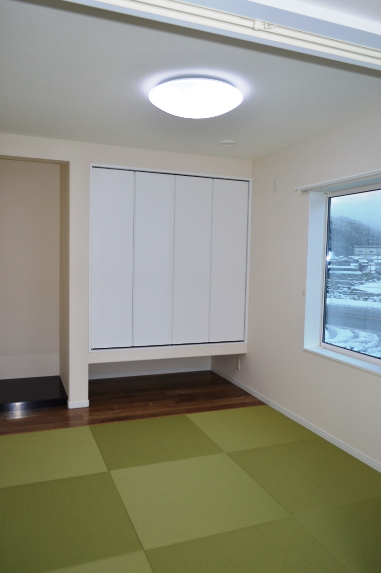 収納の下の空間はテーブルをしまえるようにと浮かせて施工しました。