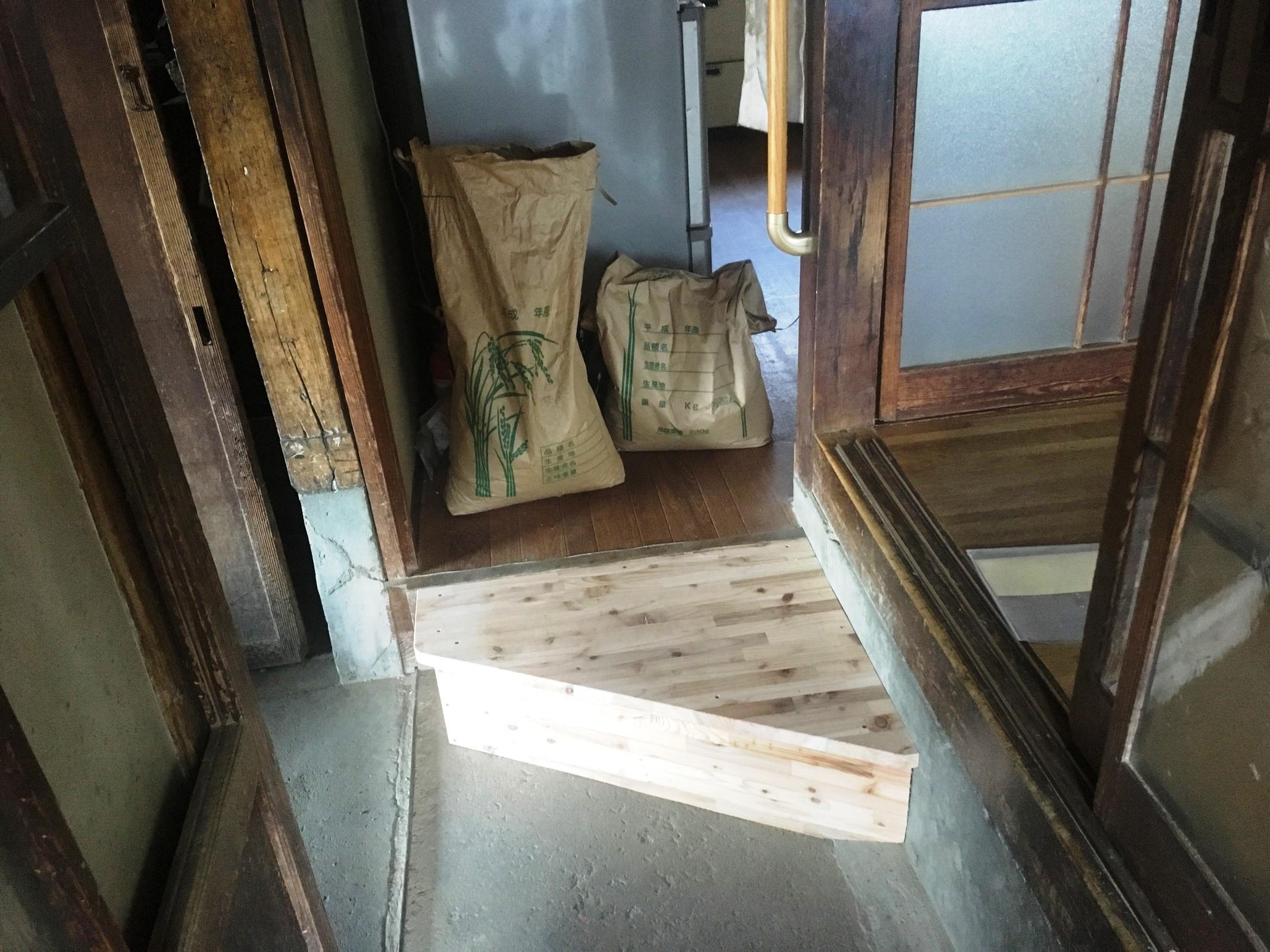 介護保険適用工事。段差が高く、上がり降りが大変だったので、敷台と、手すりを取付けました。