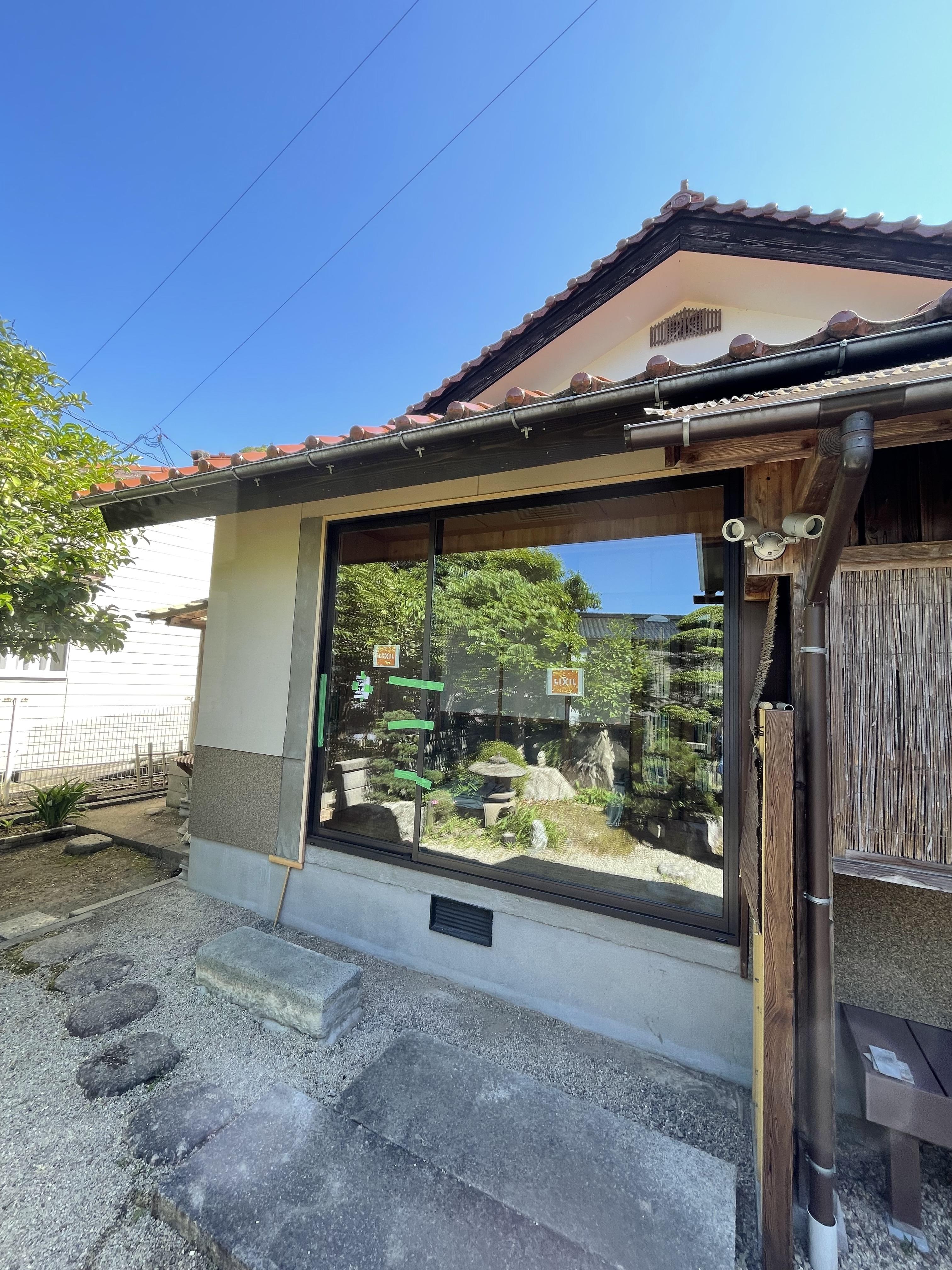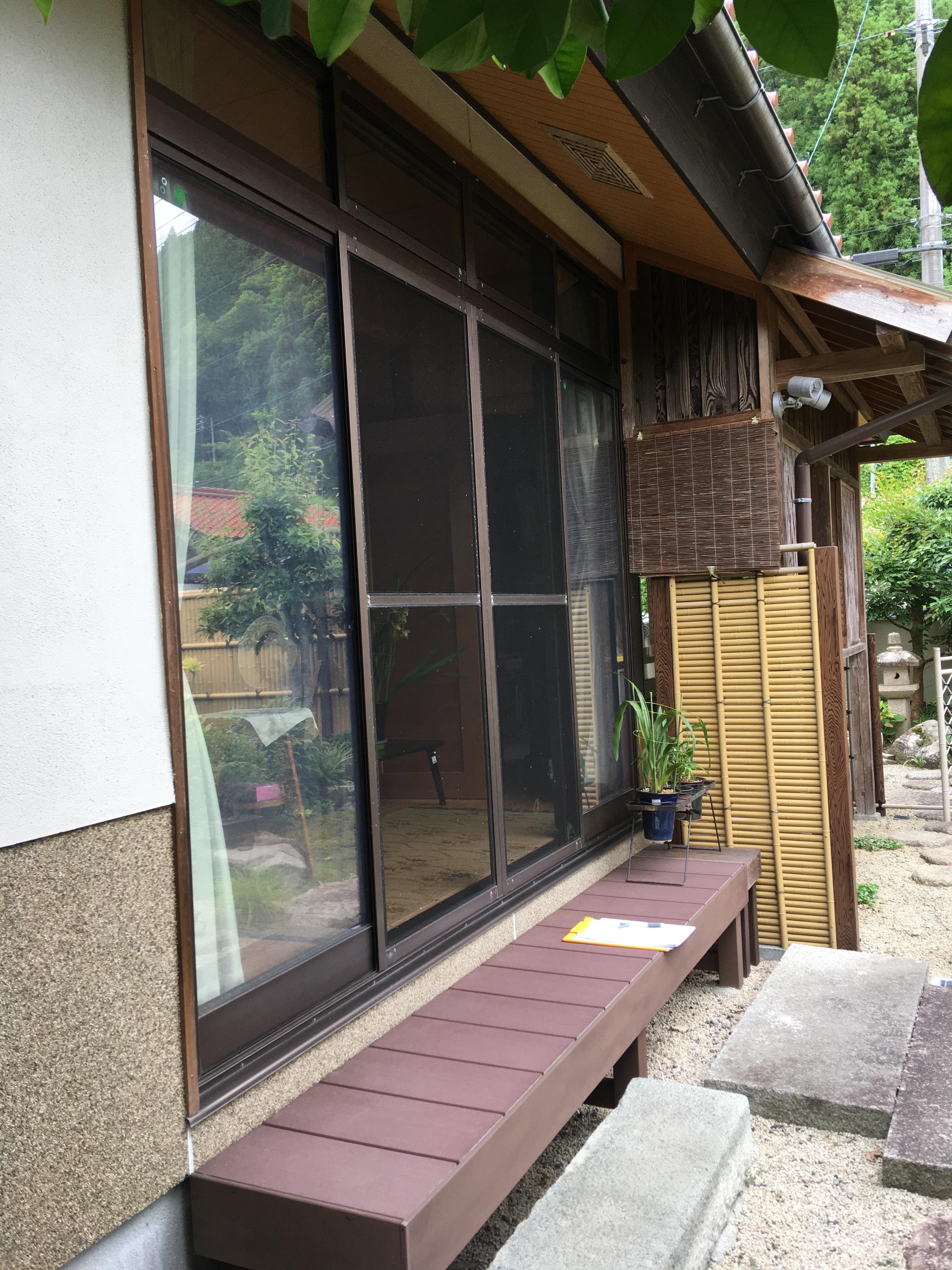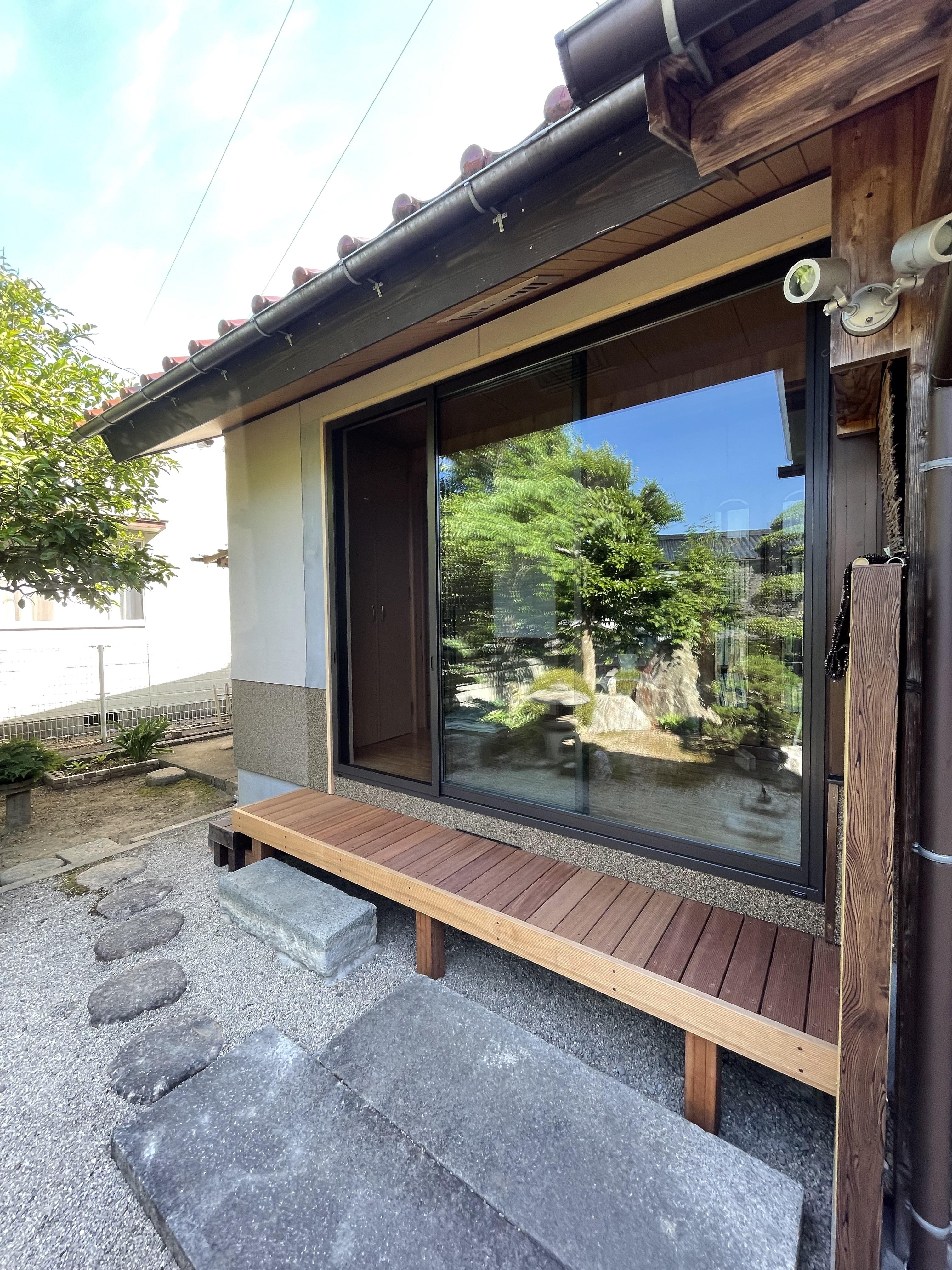 サッシ工事です。日差しが強いということで、直射日光が入りにくいガラスに変えて、 お庭を見渡せるように大きなガラス窓を施工させて頂きました。 縁側も、今回の工事で、大工さんのお手製の縁側を施工しました。