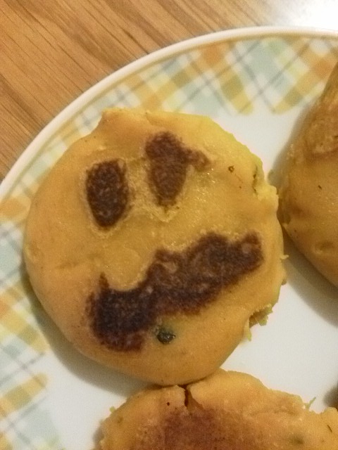 このかぼちゃ団子、ハロウィンのかぼちゃんのお化けみたいに見えませんか??