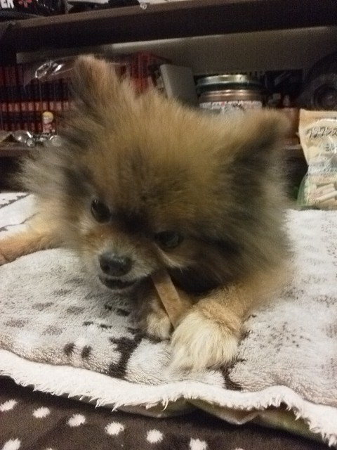 で、おやつをあげたら、写真撮ってるのもお構いなしでガッツいてます(笑)