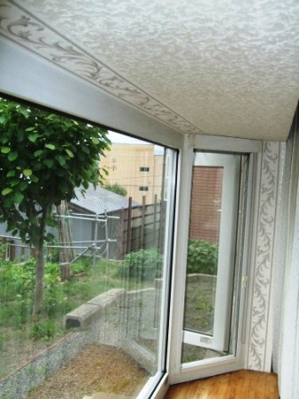 今回、外壁工事をさせて頂いたお客様のお宅です。 外壁工事中、元々の外壁を剥がしていた時に大雨が降ってきました。 ちょうどお客様はお出掛け中で帰ってきて見たら、出窓がびしょびしょになってたそうで、出窓の壁紙に雨ジミが残ってしまいました。 雨ジミのため出窓全体の壁紙貼り替えを提案しましたが、お客様の希望で部分的の貼り替えになりました。 このラインの柄はうちの店長が決めさせて頂きましたが貼り替え後、凄く素敵になってお客様も大満足でした。