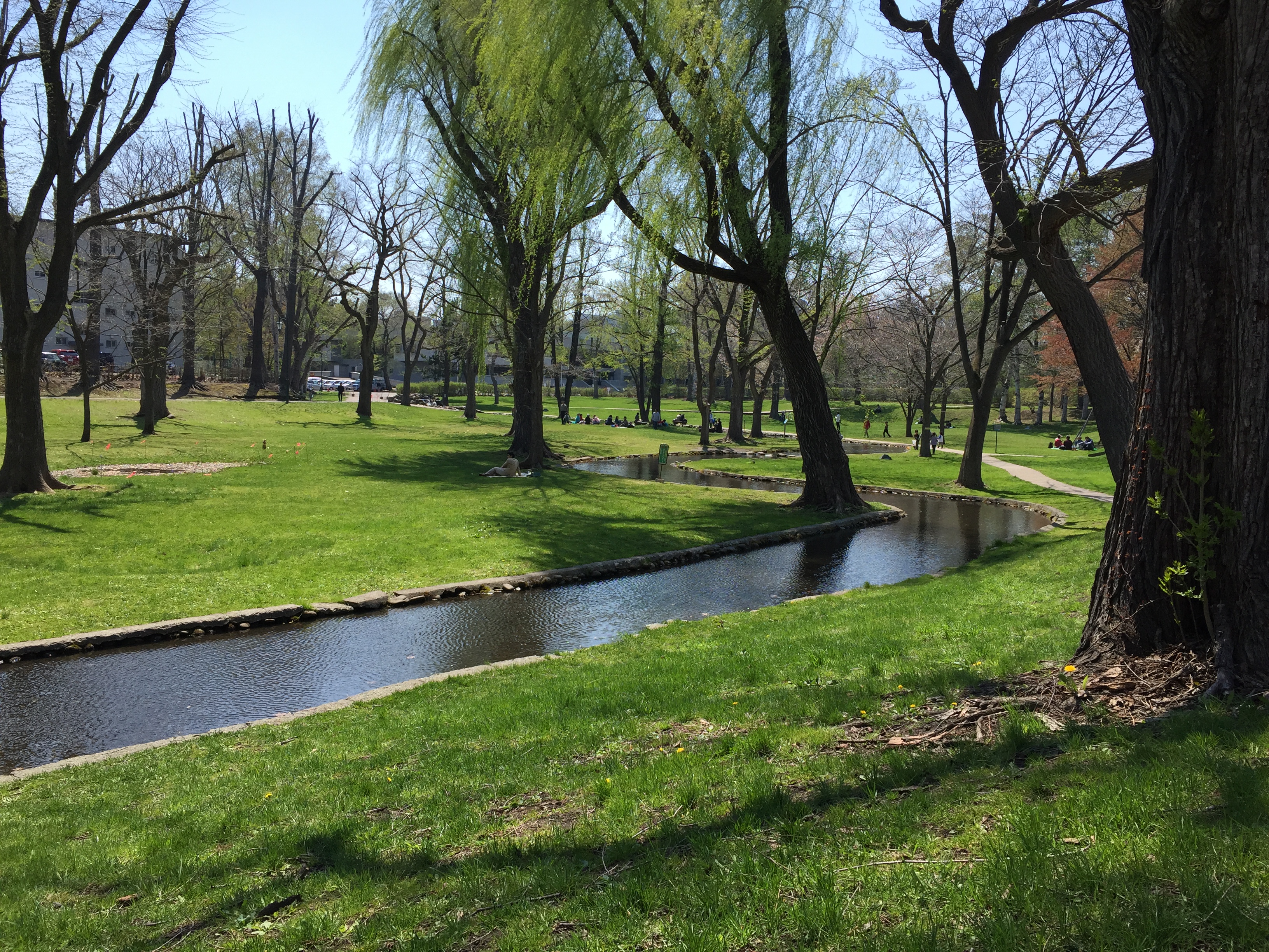 のどかです。 小さな川が流れていて人懐っこい鴨もいましたし、芝生で皆さん昼食を食べたりお話ししたりなんとも楽しそうです。