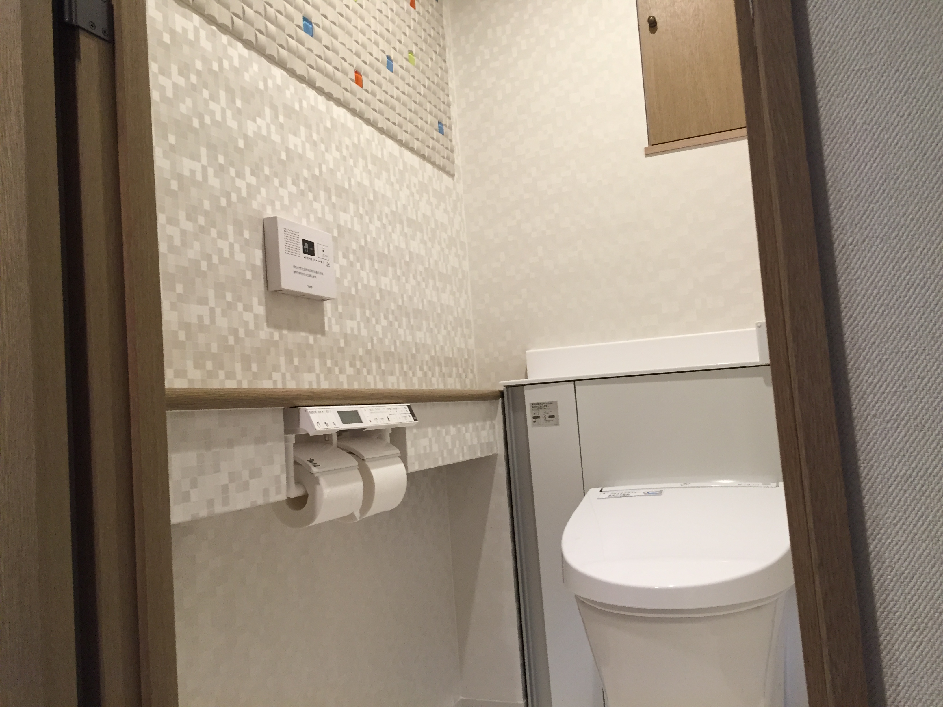 こちらはトイレです。 LIXILのリフォレに交換した際、壁にアクセント+消臭目的で施工しました。