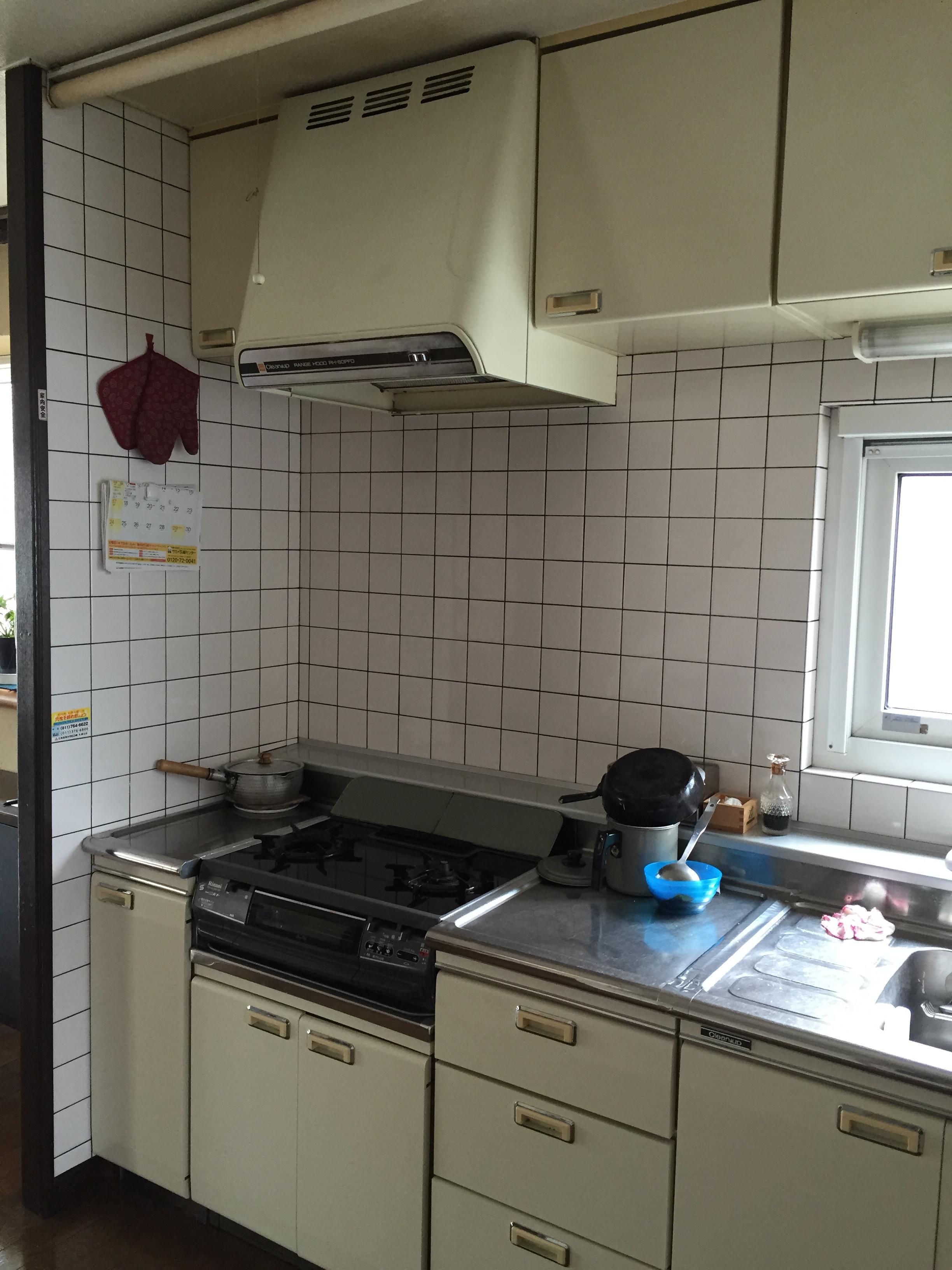 300mm巾の吊戸棚を外し、150mmとなった隙間にはキッチンパネルを貼りました。