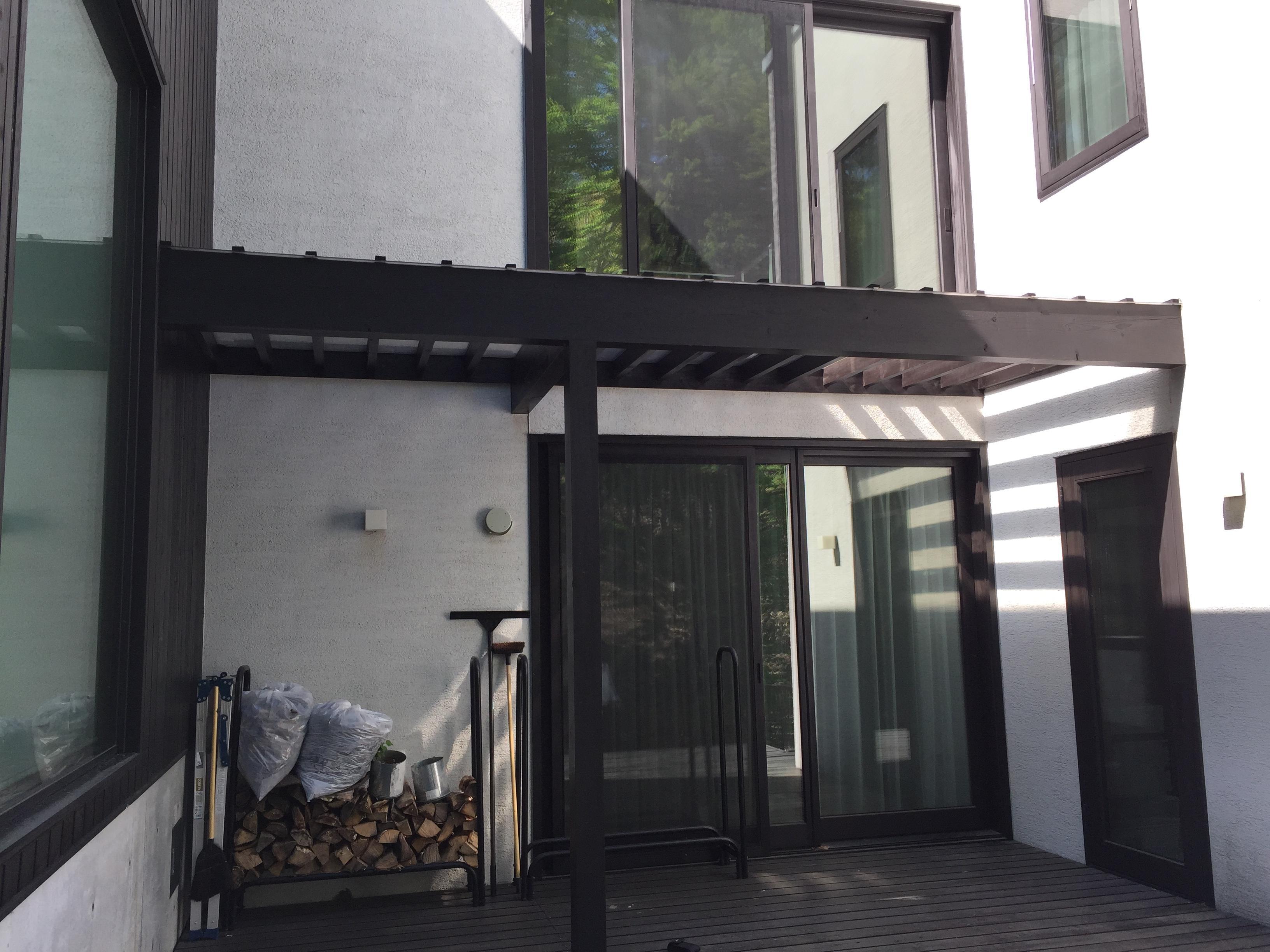 今回はお庭のウッドデッキ上に屋根が付いているのですが、ウッドデッキの奥行きに対して4分の1程度しかないため残りの分を覆うほどの大きいサイズを取り付けました。