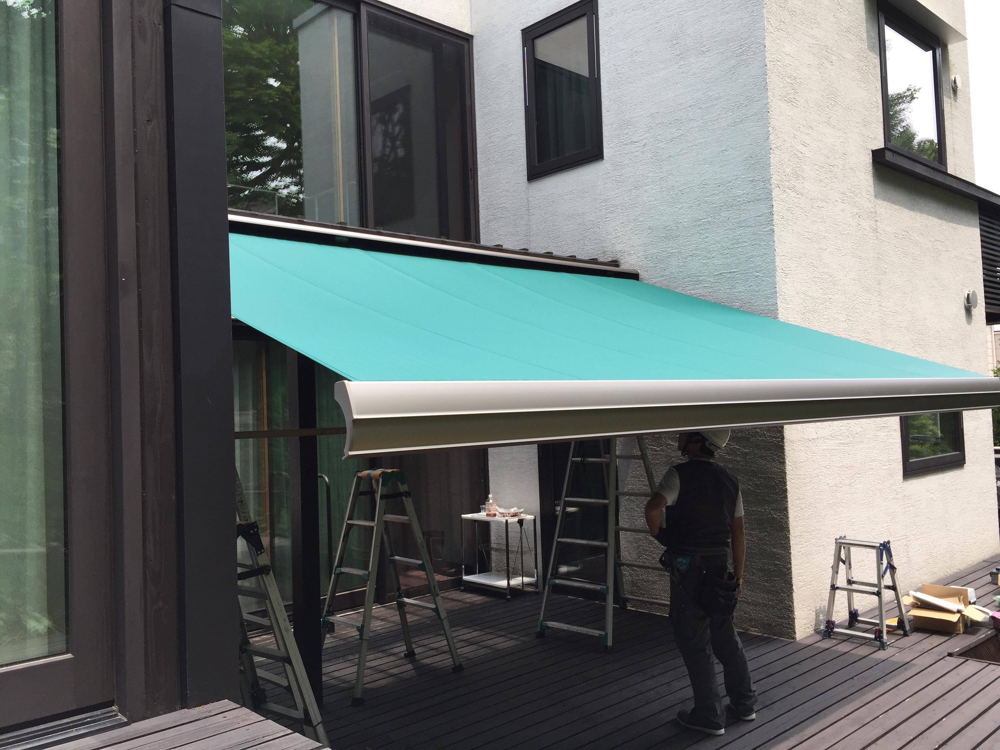 そんな中、先日夏が本番を迎える前にオーニング(日除け)を設置してきました。