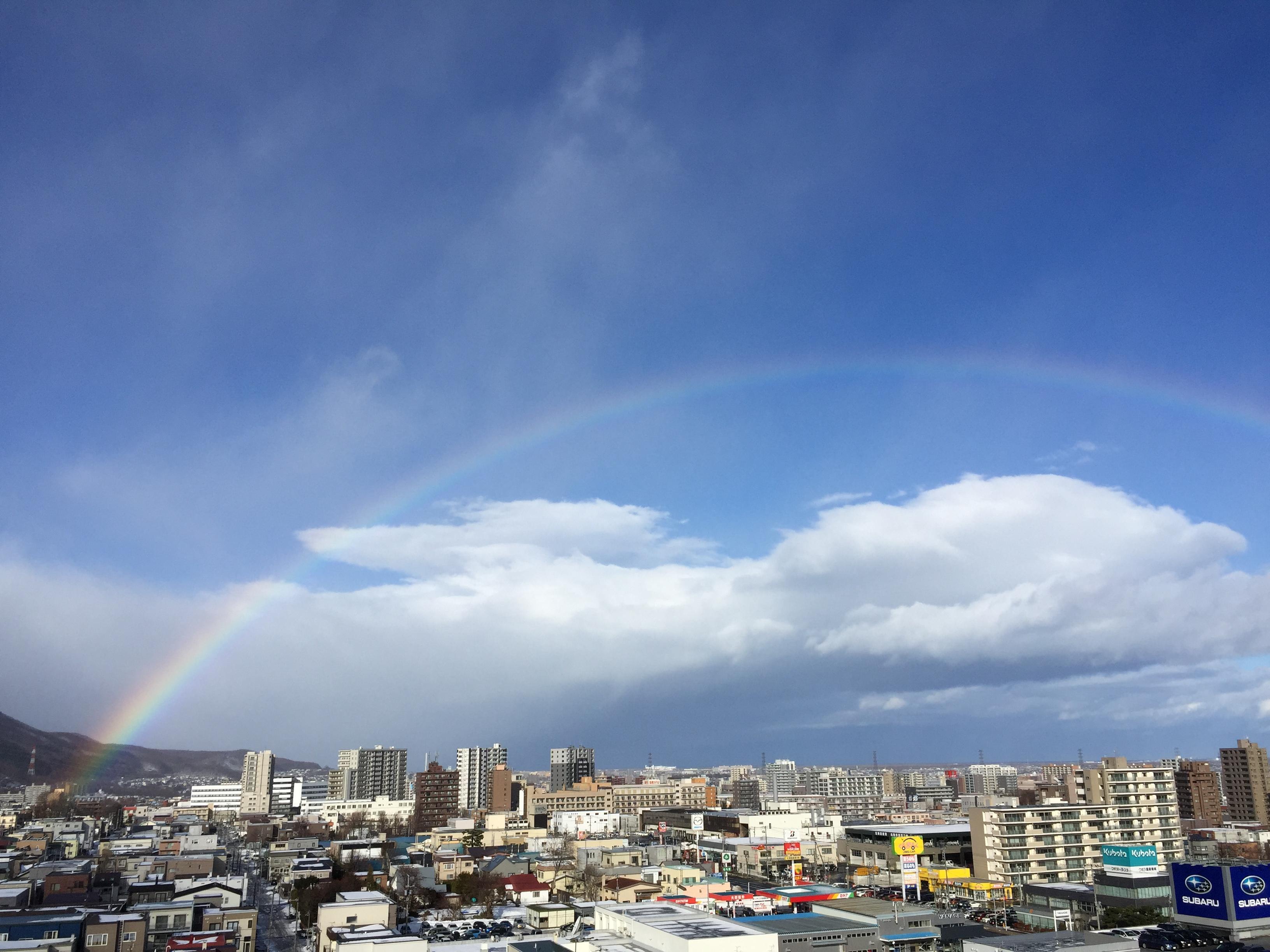 札幌に引っ越してきてからというものきれいなアーチ型の虹を見る機会が増えました。高層の建物が少なく見通しが良いので今回のような高い場所からじゃなくても見かけます。私個人的には虹が大好きで日常生活の楽しみの一つなんです。今年は何回虹を見られるかな~(*'∀')