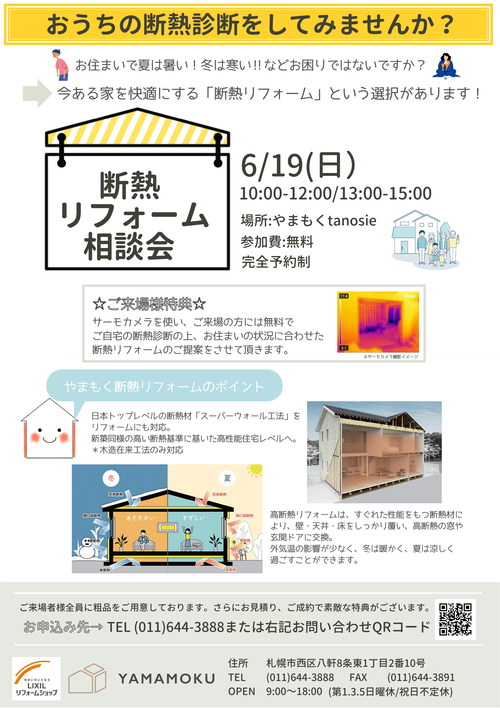 やまもくでは、今週末6月19日(日)、断熱リフォーム相談会を開催致します。 ご来場の方には、サーモカメラを使用して無料でご自宅を断熱診断させて頂き、リフォームのプロが最適なプランをご提案致します。