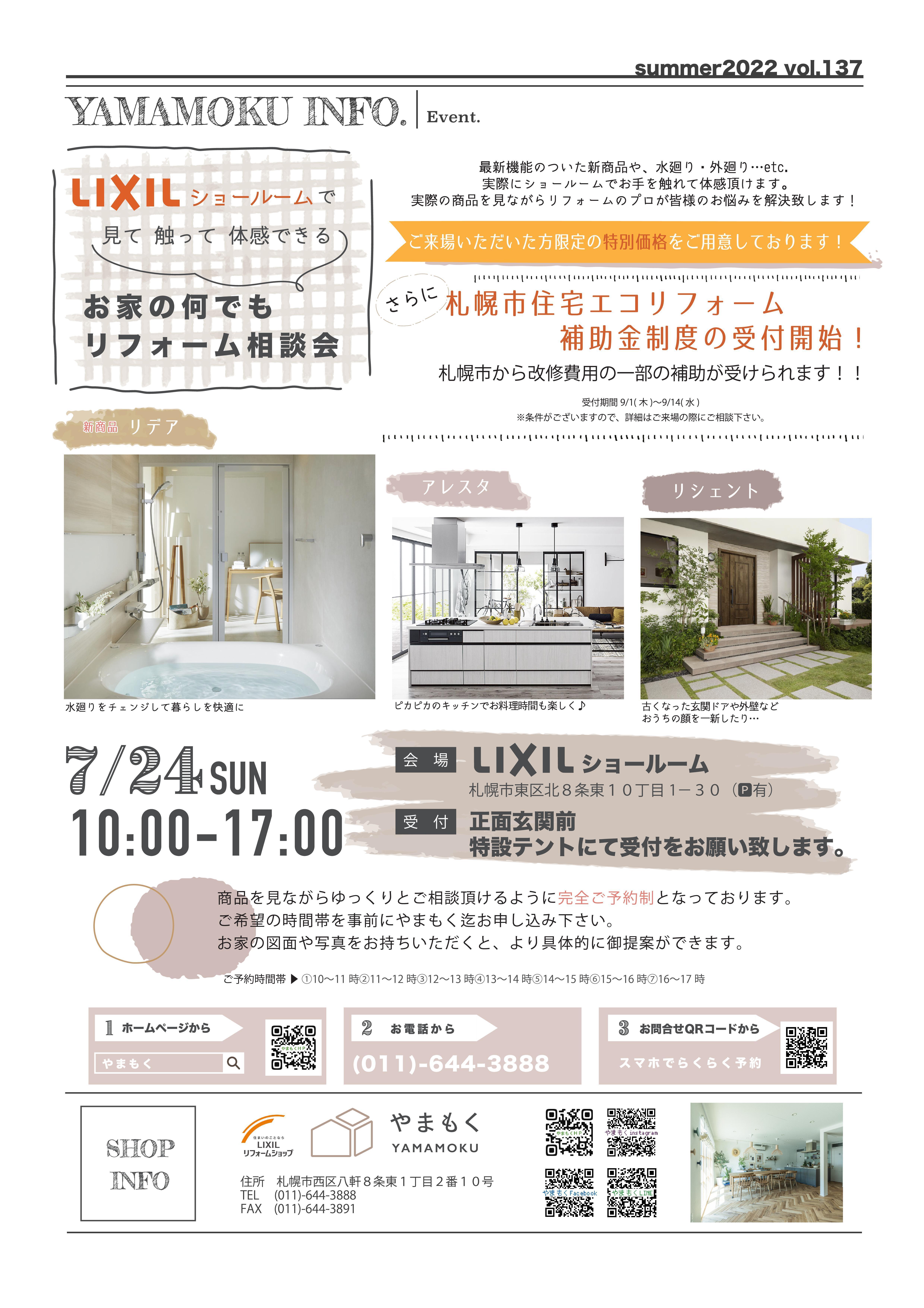 7月24日日曜日、LIXILショールームにて『お家の何でもリフォーム相談会』を開催致します!