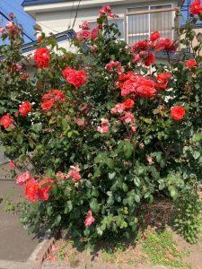 さて、先日定期訪問でお伺いした東区のOB様のお宅のお庭に、私の背丈ほどもある大きな大きなバラが、色鮮やかに大変見事に咲き誇っていましたので、お写真を撮らせて頂きました(^.^)