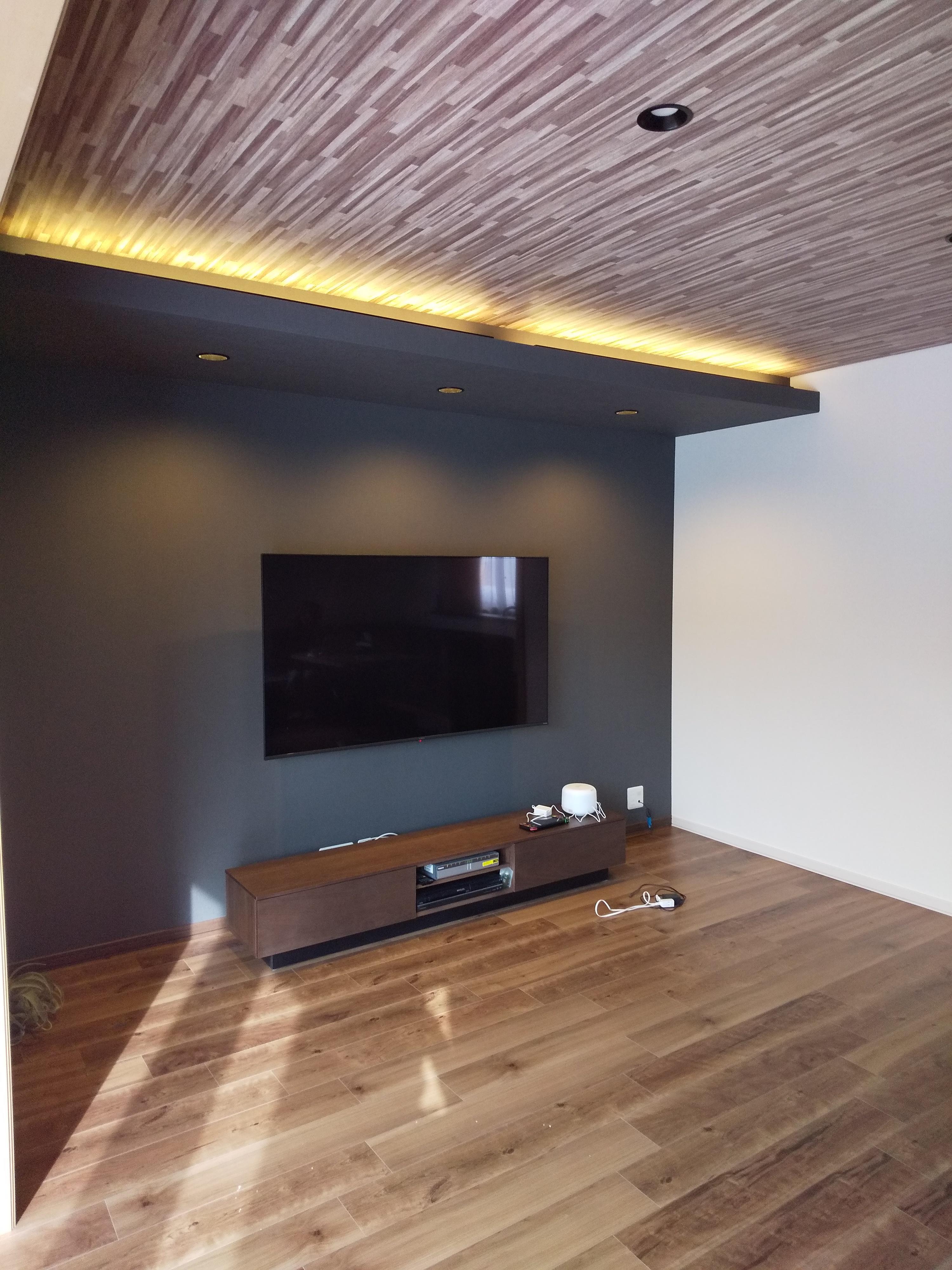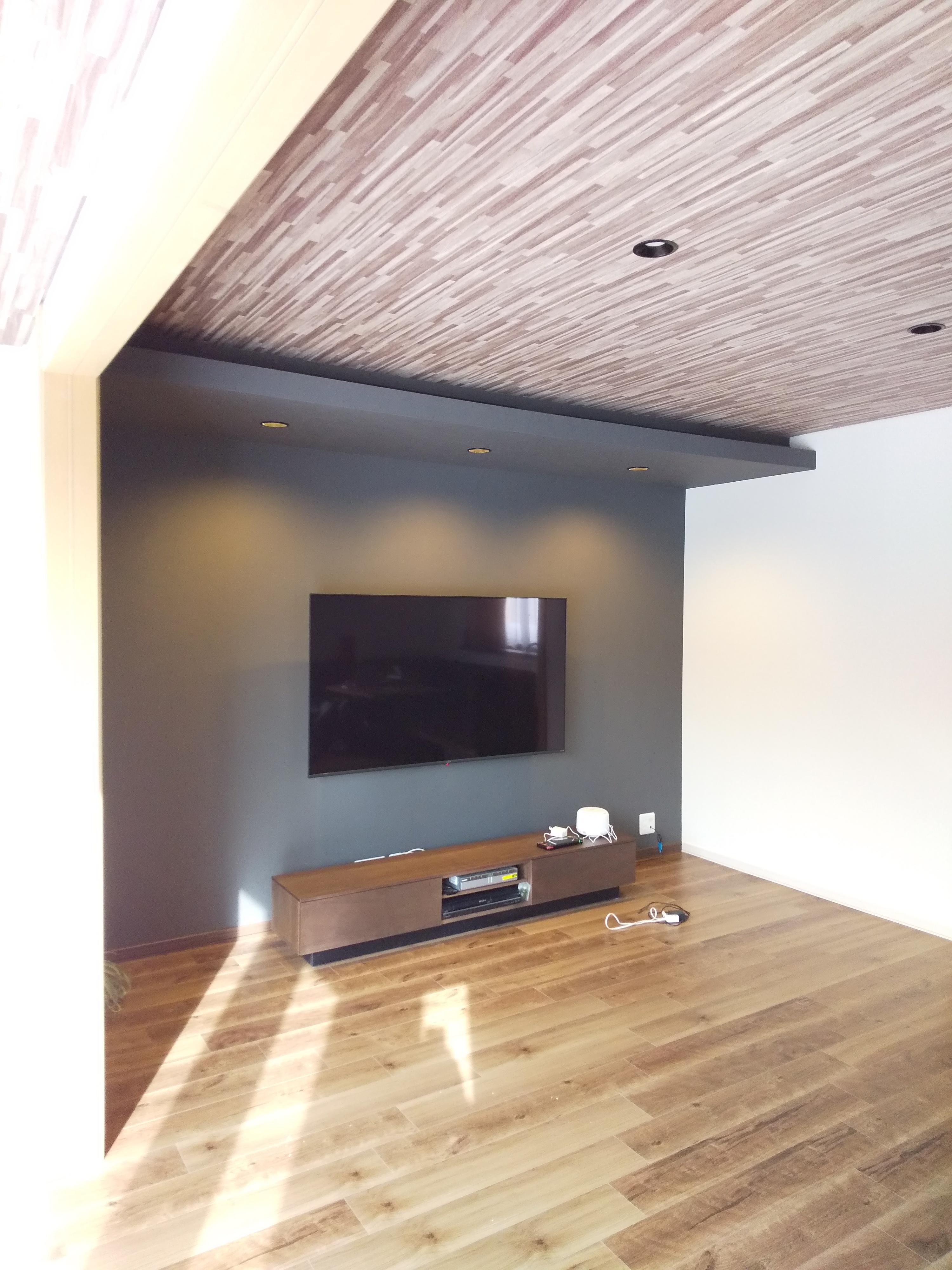 またテレビボードの背面壁と下がり天井にはダークグレー系のクロスを合わせて空間のアクセントにしています。
