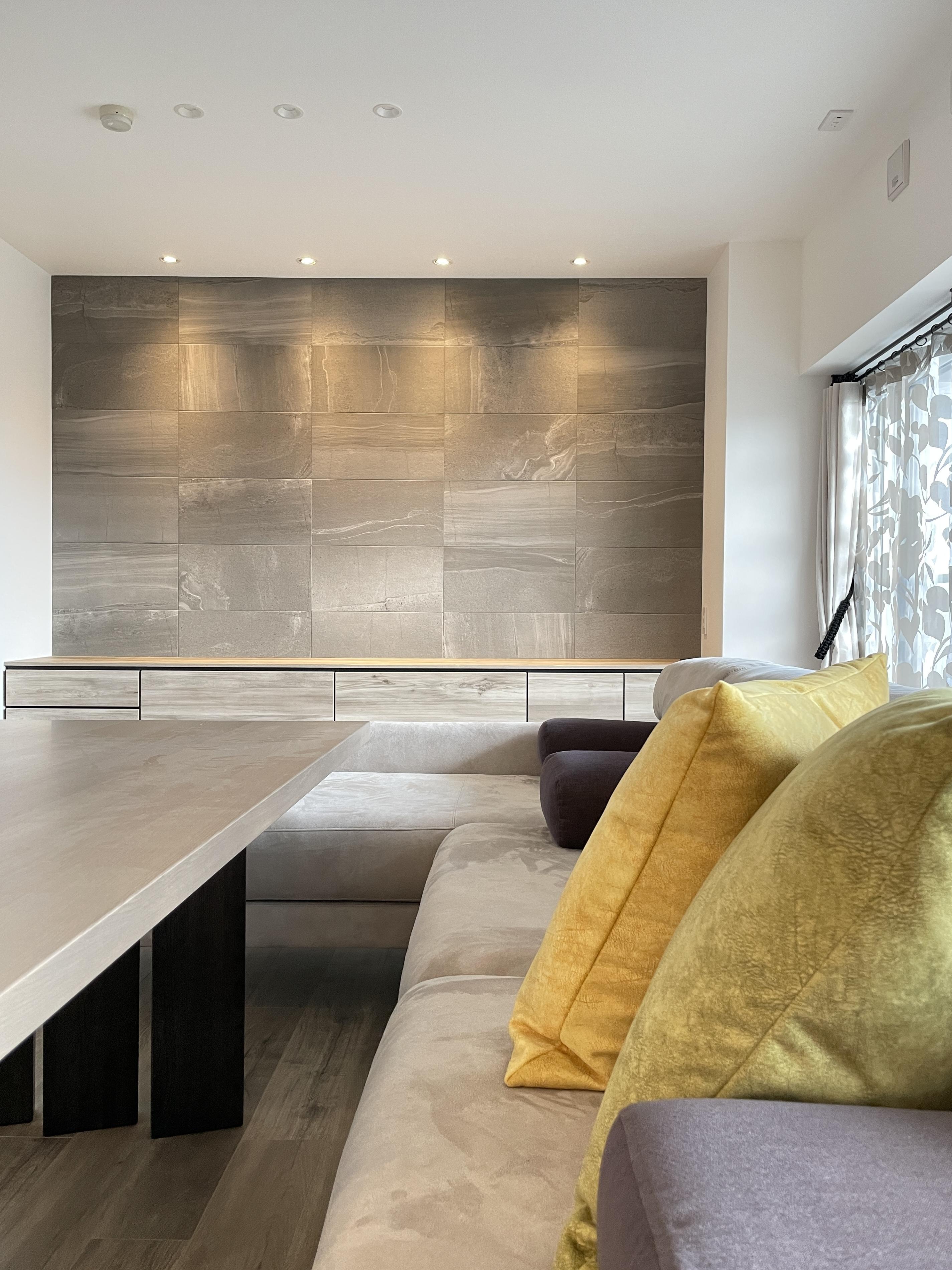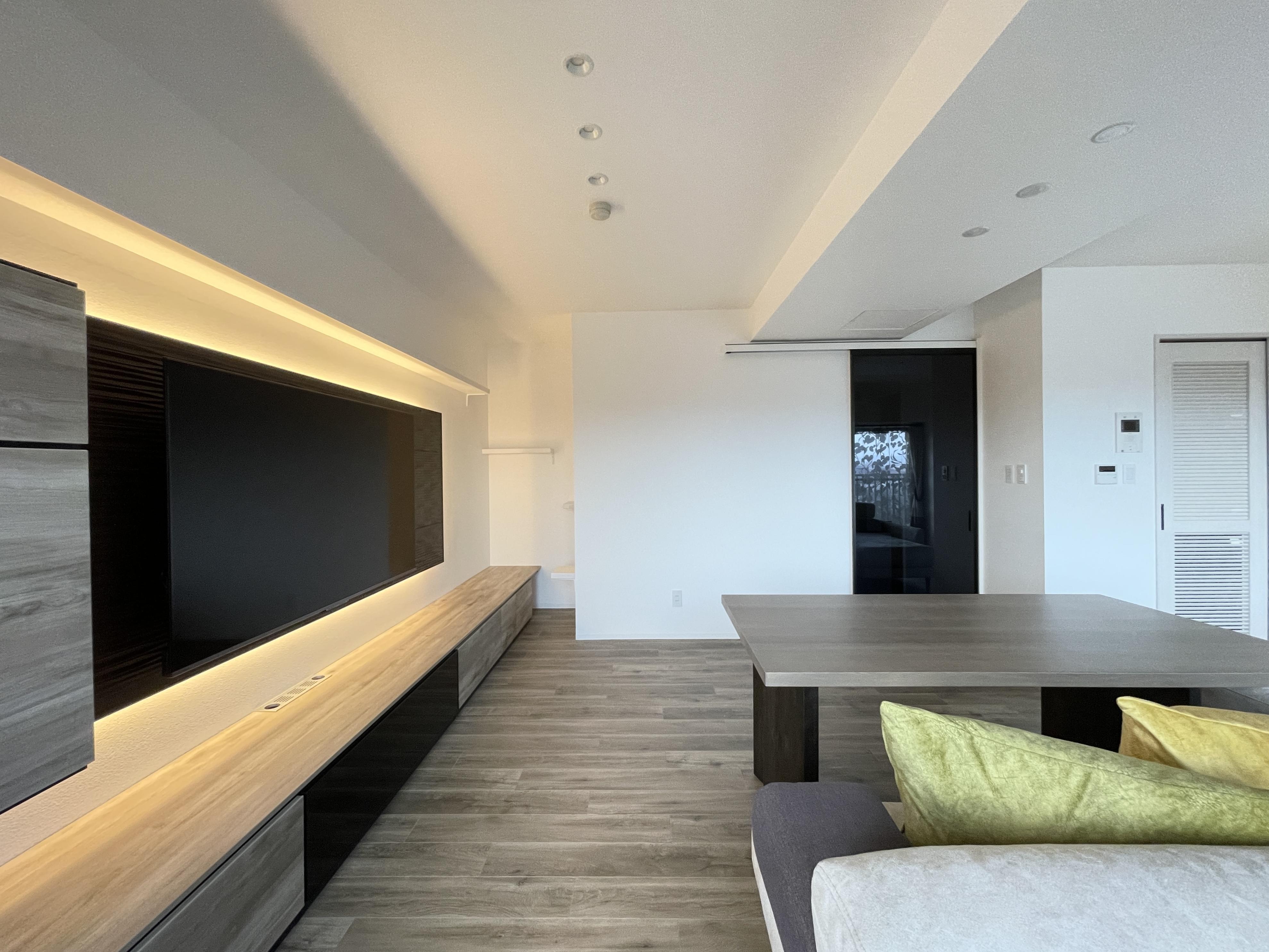 お施主様に最初にお会いした際に要望で挙がったのが、2間を繋げて広々したリビングにしたいというご要望と、愛猫の為のキャットウォークやゲージの場所を確保したいという2点でした。 2間を繋げたリビングには大きなL字型のソファやカリモクのテーブルをお施主様と一緒にショールームを廻り空間サイズにピッタリのものを選定しました。 キャットウォークはTVボードの一番目立つ位置に設け、TVを見ながらも猫ちゃんの様子が分かるようプラン。 また、TV廻りには間接照明をご提案。大人なご夫妻のくつろぎの時間をよりリラックスできる空間で過ごしていただけるようご提案させていただきました。