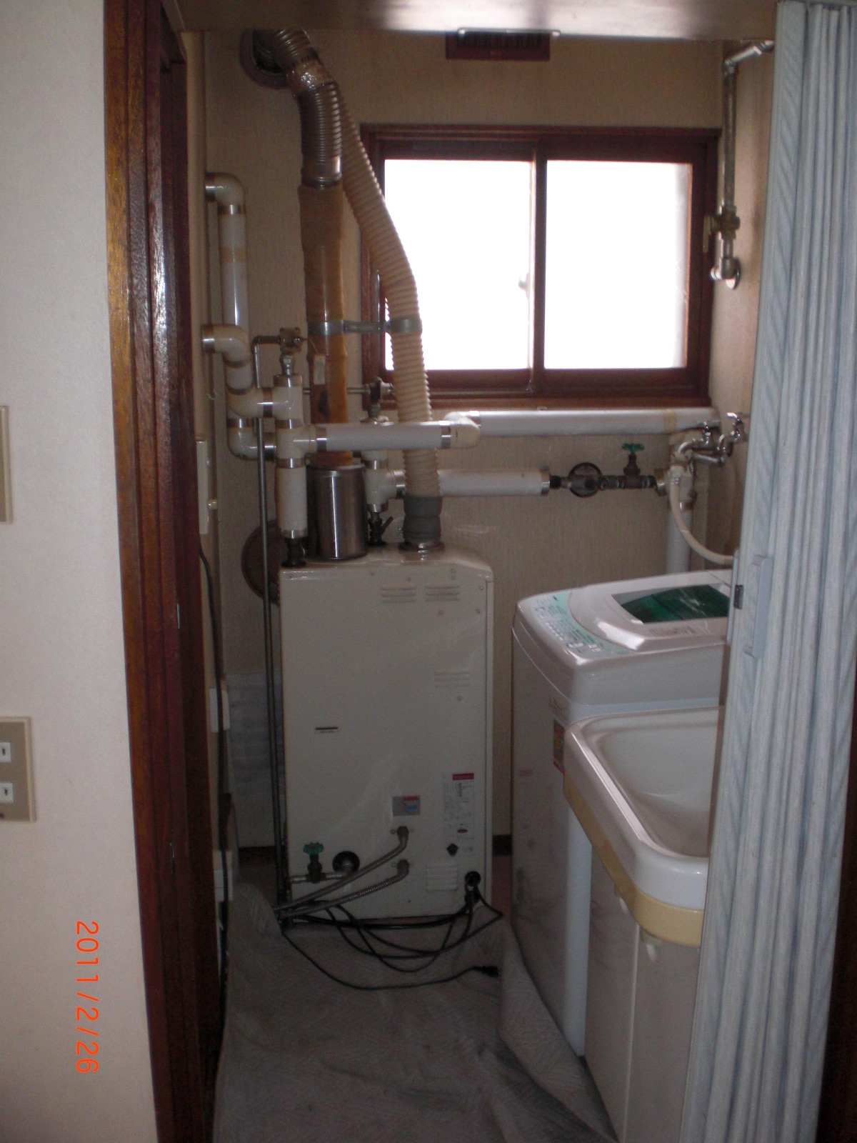 これで、使えるスペースも広がりますよね。 写真を見比べてください。 床置きタイプのボイラーがなくなると、洗濯機を奥に詰めて 洗濯機と洗面化粧台の間に、棚を置く事ができました。 どうですか?