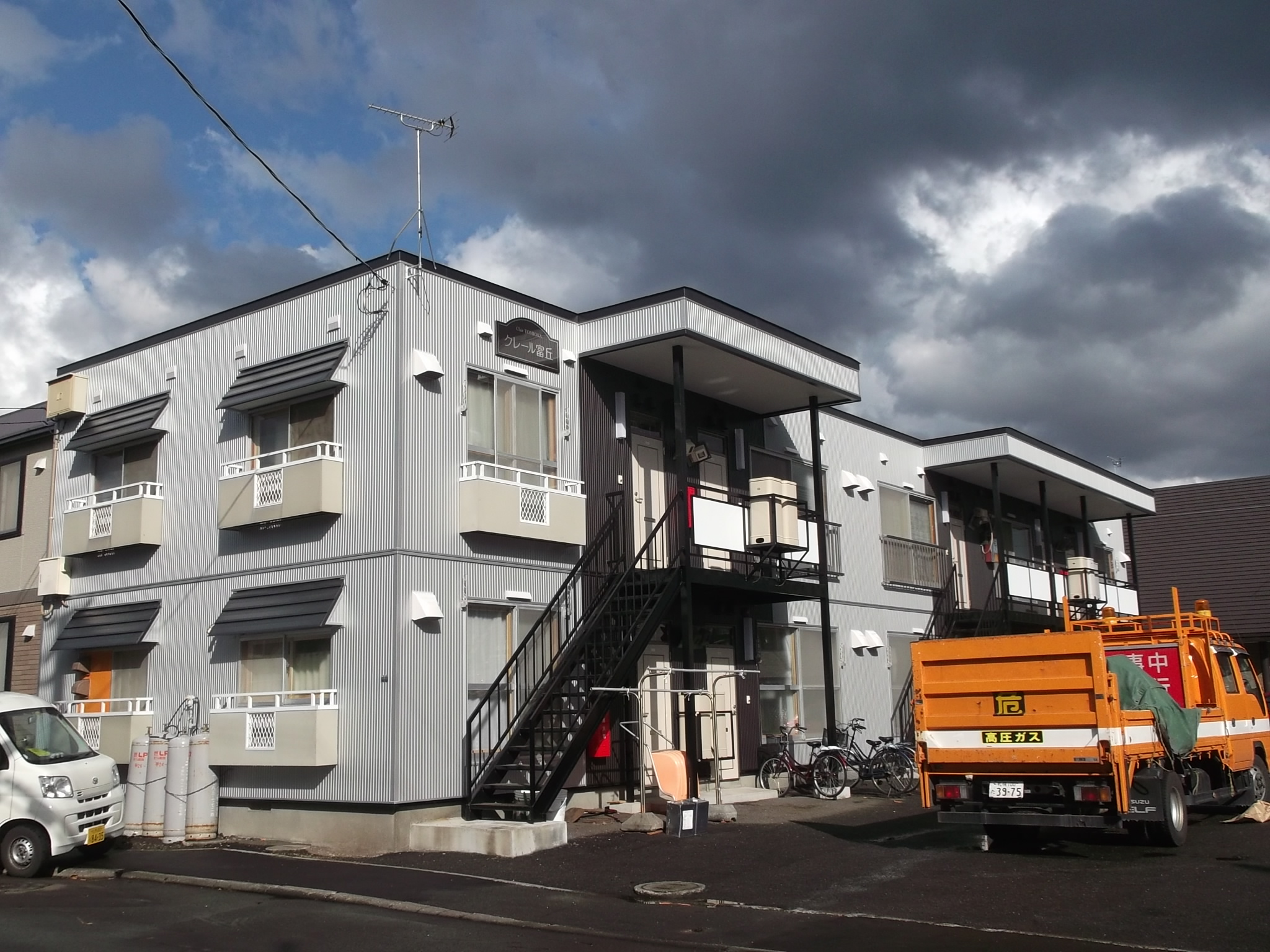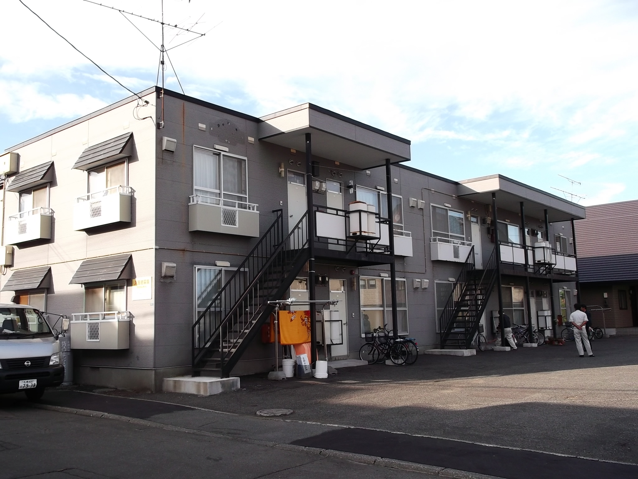 アパート外壁張替え工事です。少し遠くからの写真ですが、とても綺麗になりました。市の道路作業車がちょっと失礼しますが・・・シャープなアパートになりました。