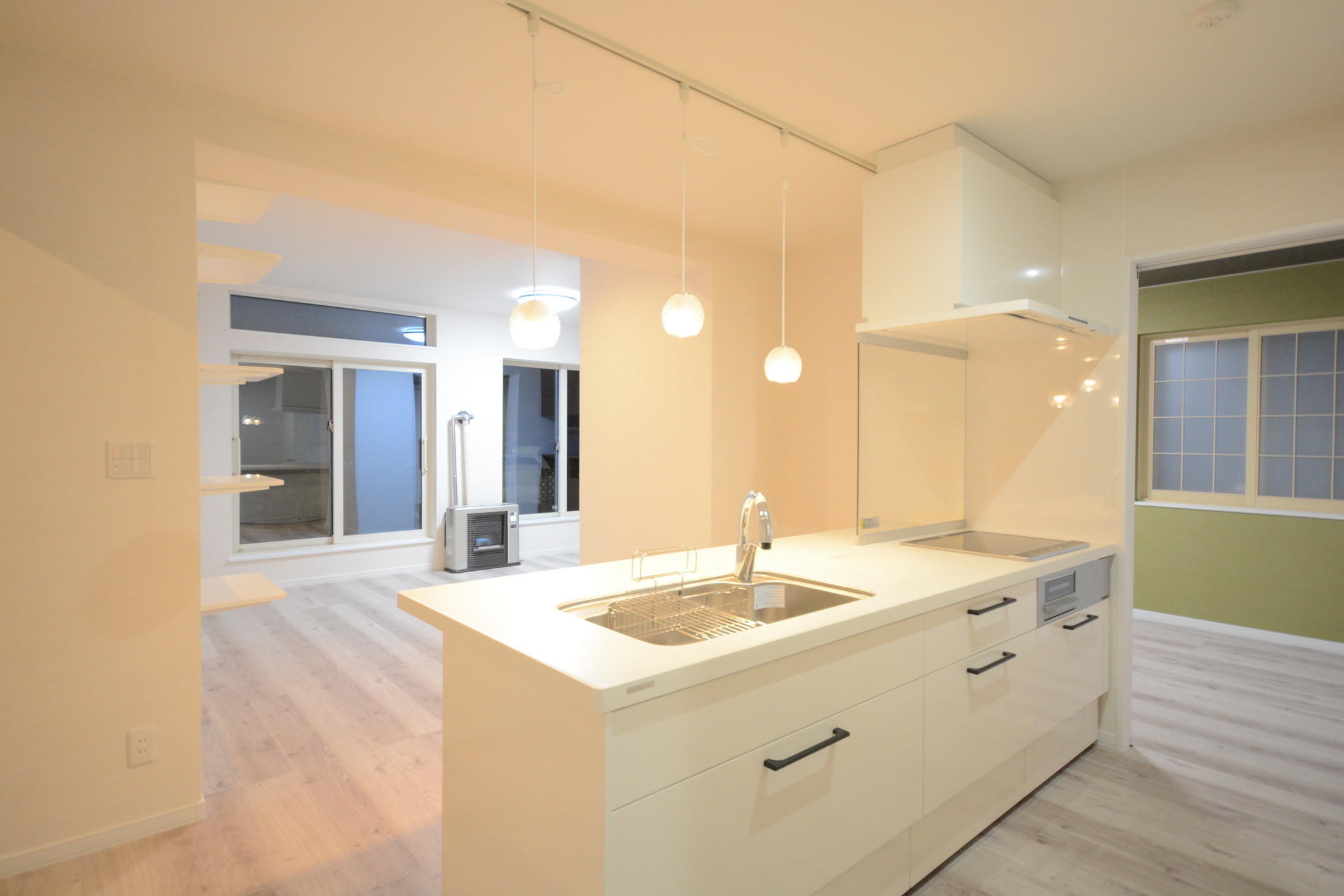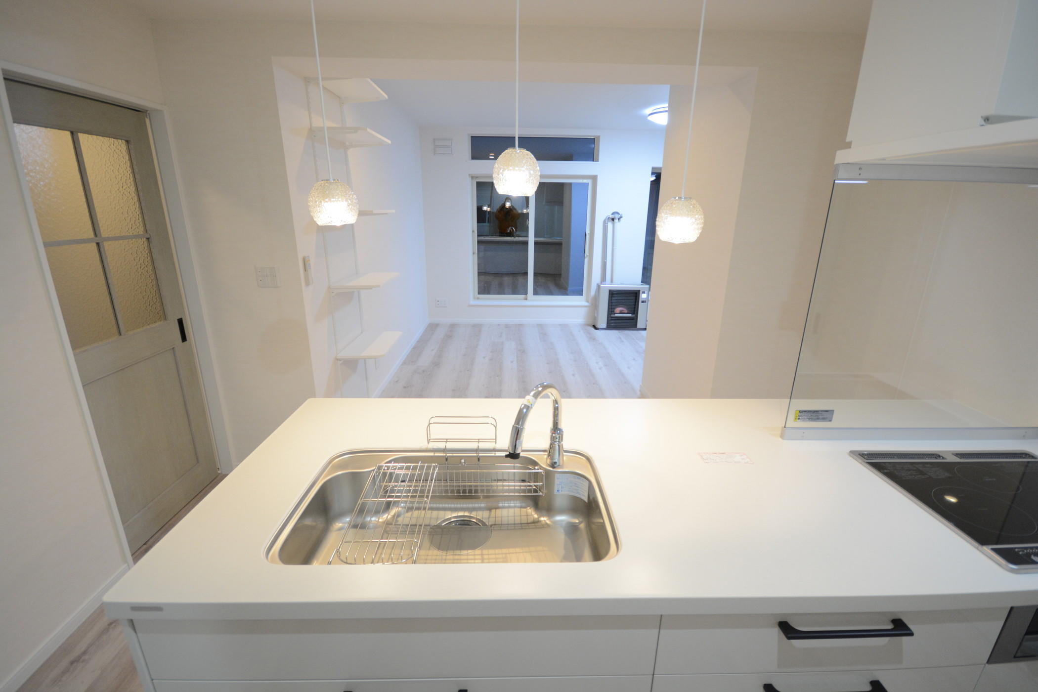キッチンの裏へ回ると、真っ直ぐな動線に沿って洗面スペース・バスルームへと続き、快適で使い勝手の良い空間へと劇的に変わりました。
