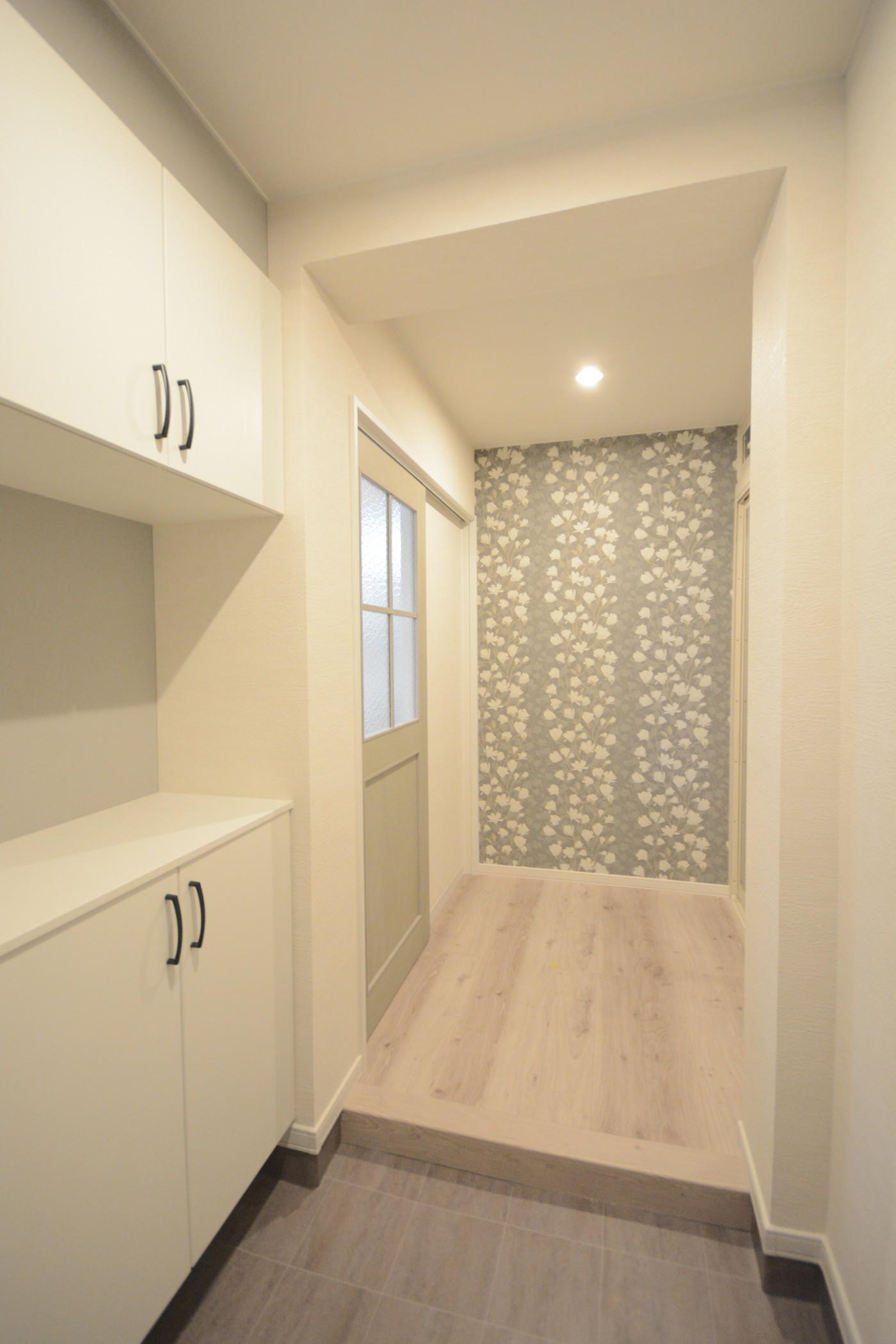 白を基調としたさわやかな玄関。シューズクローゼットを取付、突き当り正面にはお施主様お気に入りのクロスを貼り、上品な玄関に仕上がりました。