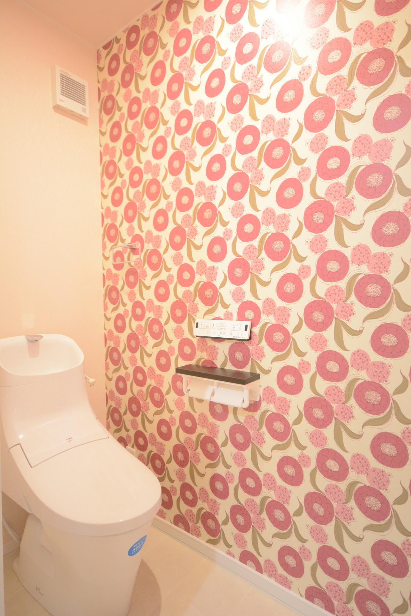 お施主様が一目ぼれで決めたという花柄のクロス。大きめで大胆なようですがとても素敵なアクセントになりました。トイレはLIXILベーシア。