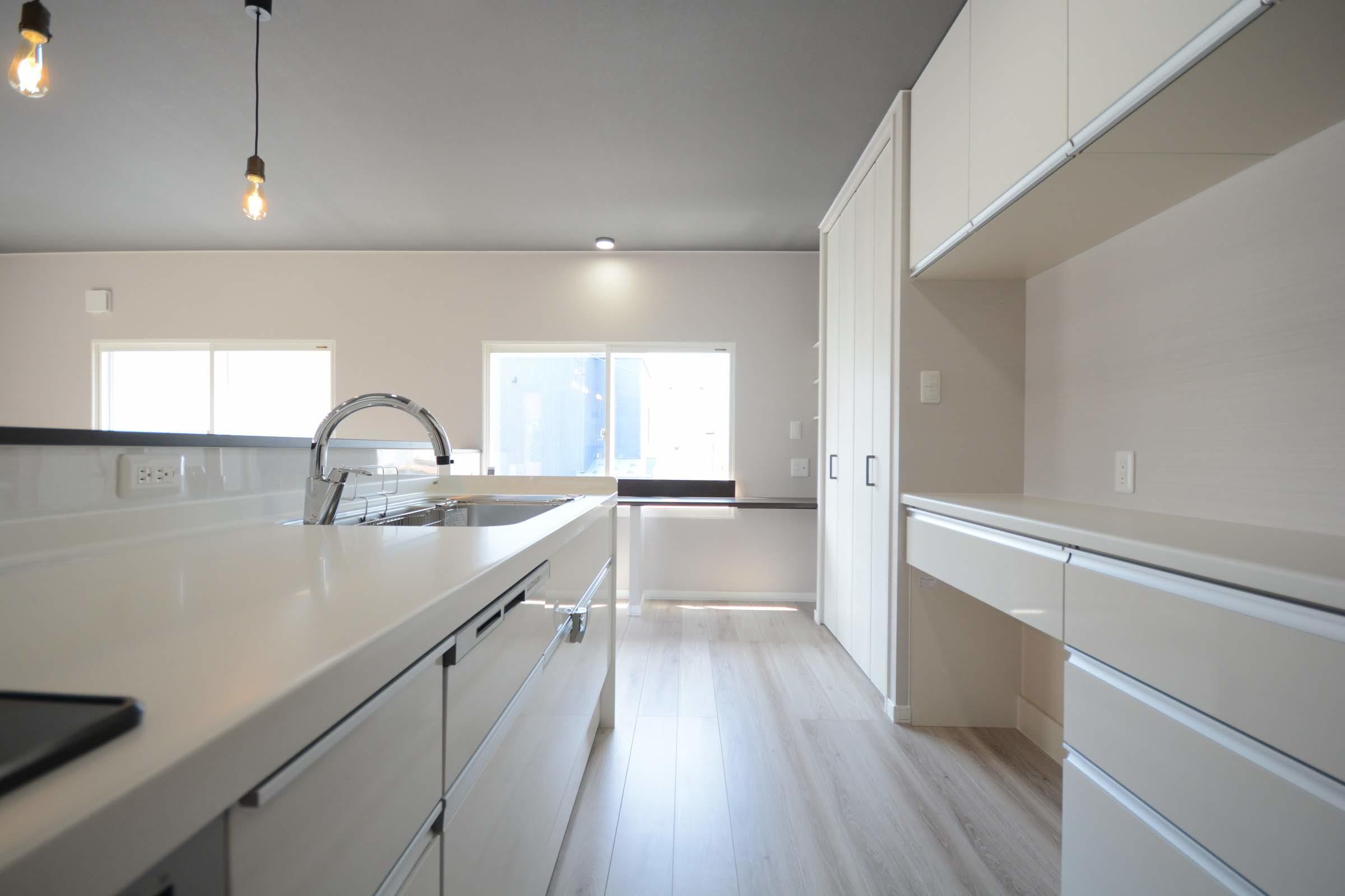 対面タイプのキッチンで、背面には食器棚とパントリー、