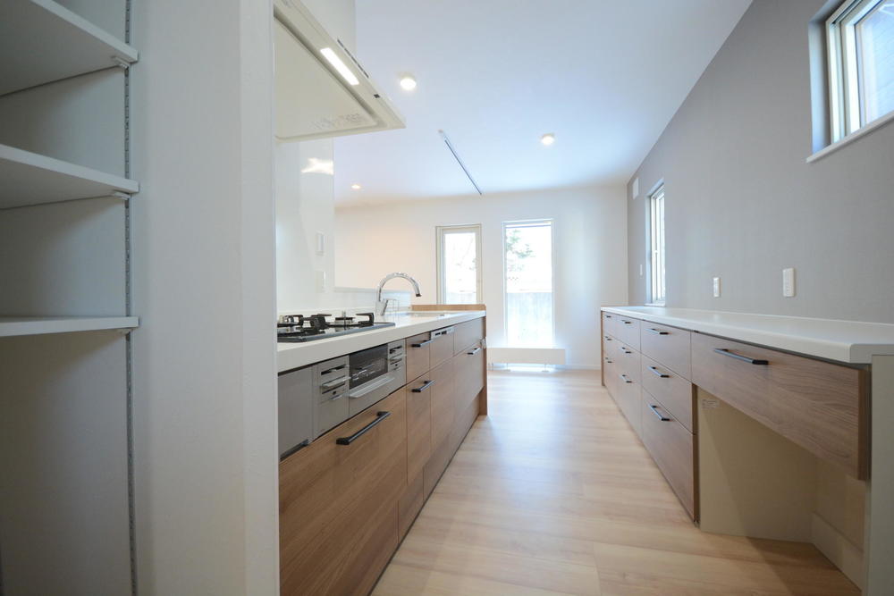 台所周りの収納は外壁側に並べることで収納力と動線が解消されました。