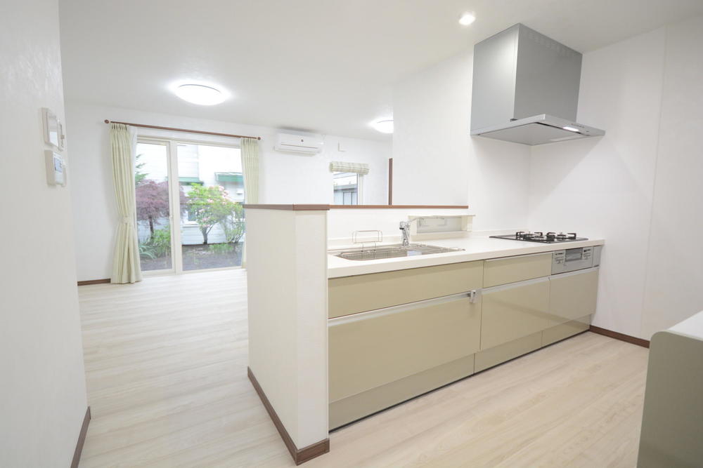 キッチンの向きを変えて背面に食器棚と冷蔵庫が並ぶように位置を変えました。