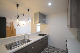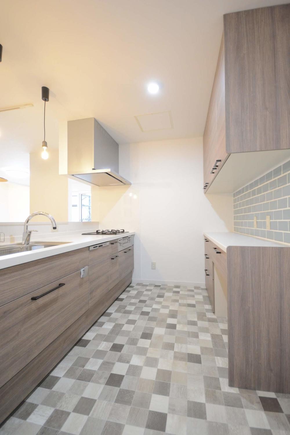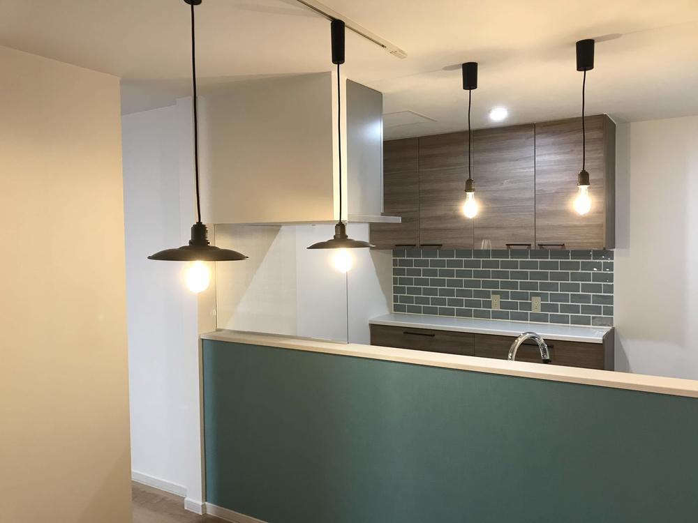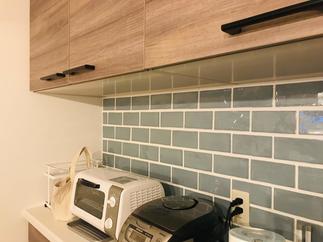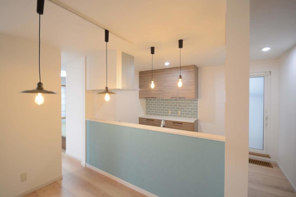 全体的にはナチュラル、ポイントでグレイッシュなブルー系の腰壁とタイルを施工しました。