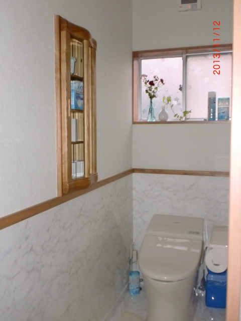 壁収納を設け、ちょっとした小物とトイレットペーパーの収納力アップで喜ばれました。