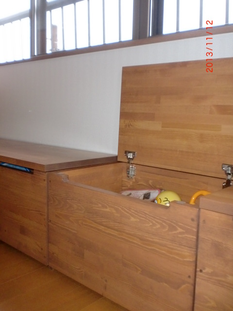 お孫さんが遊びに来た時のおもちゃを収納出来るベンチチェストを建具やさんにオーダー。