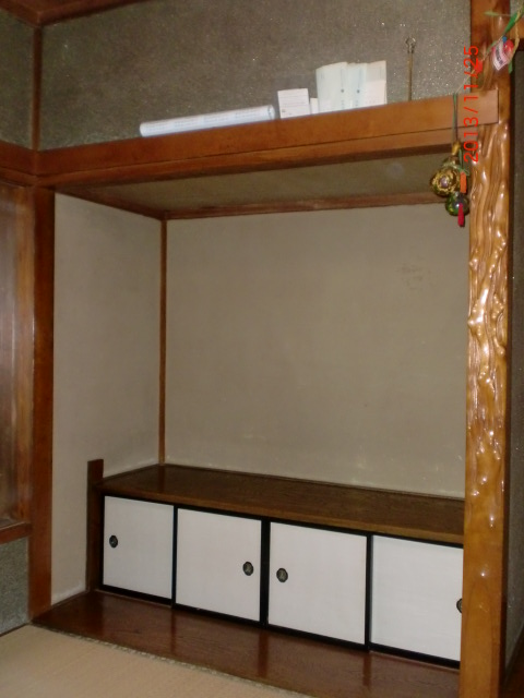 お仏壇の寸法を元に地袋を作成・・・収納能力が増えました。 ヤニ松の地袋セットを使い、周りの色やお仏壇の色味に合わせました。