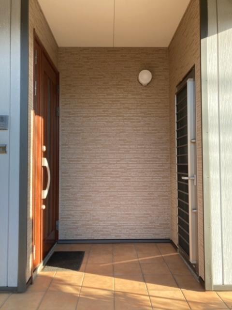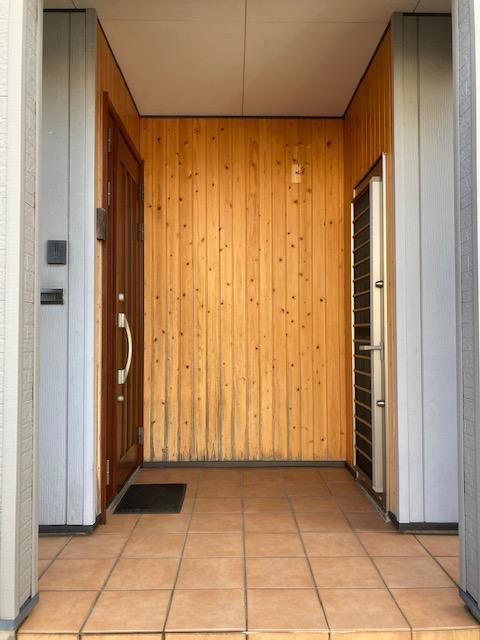 新築当時、玄関ポーチ部分だけ趣のある木材を張らせて頂きました。 天然素材の木材ですから、表面の塗膜をメンテナンスしてあげないと早めに傷んでしまいます。 今回は表面が丈夫な鉄板サイディングを重ね張りさせて頂きました。
