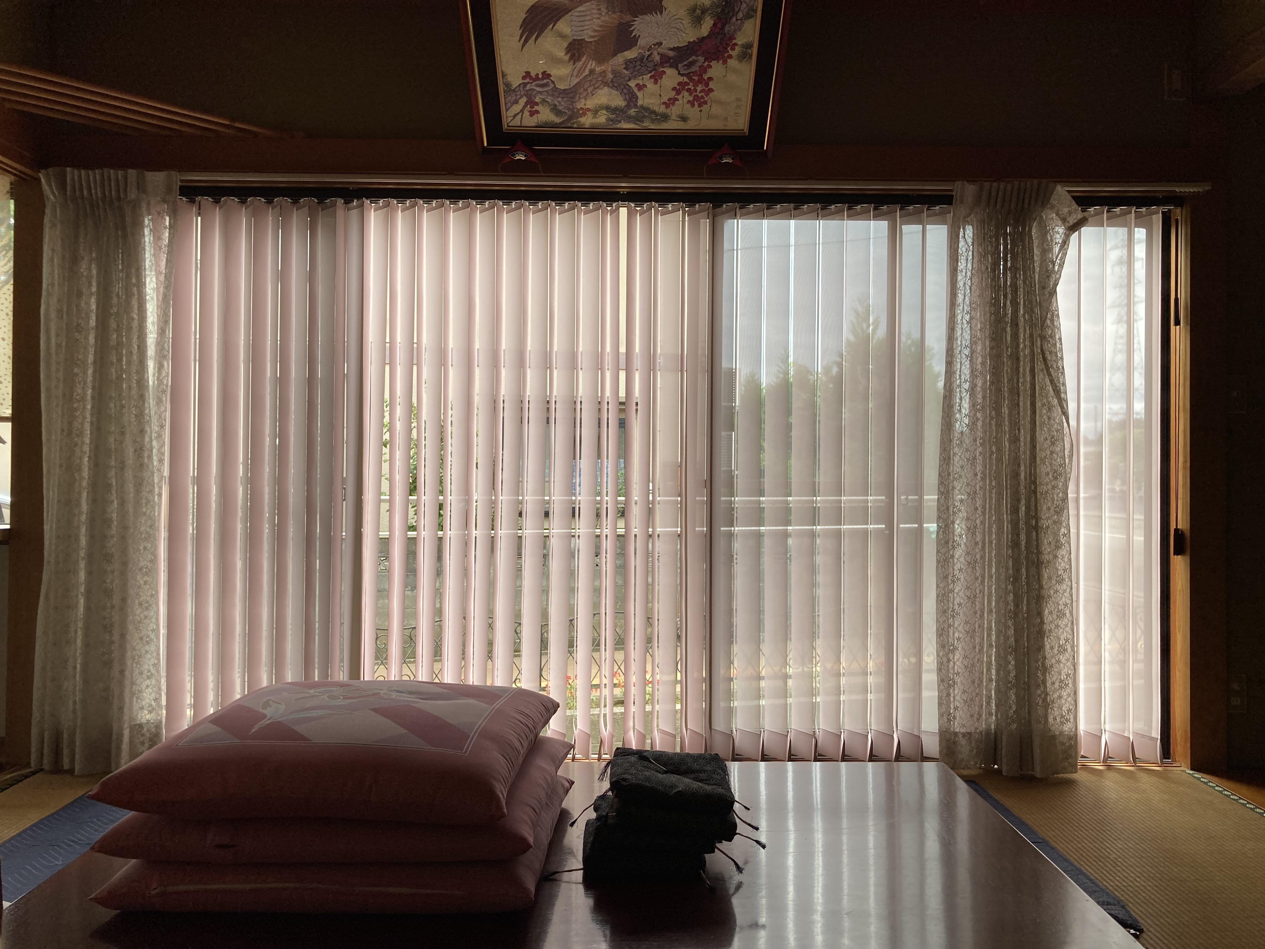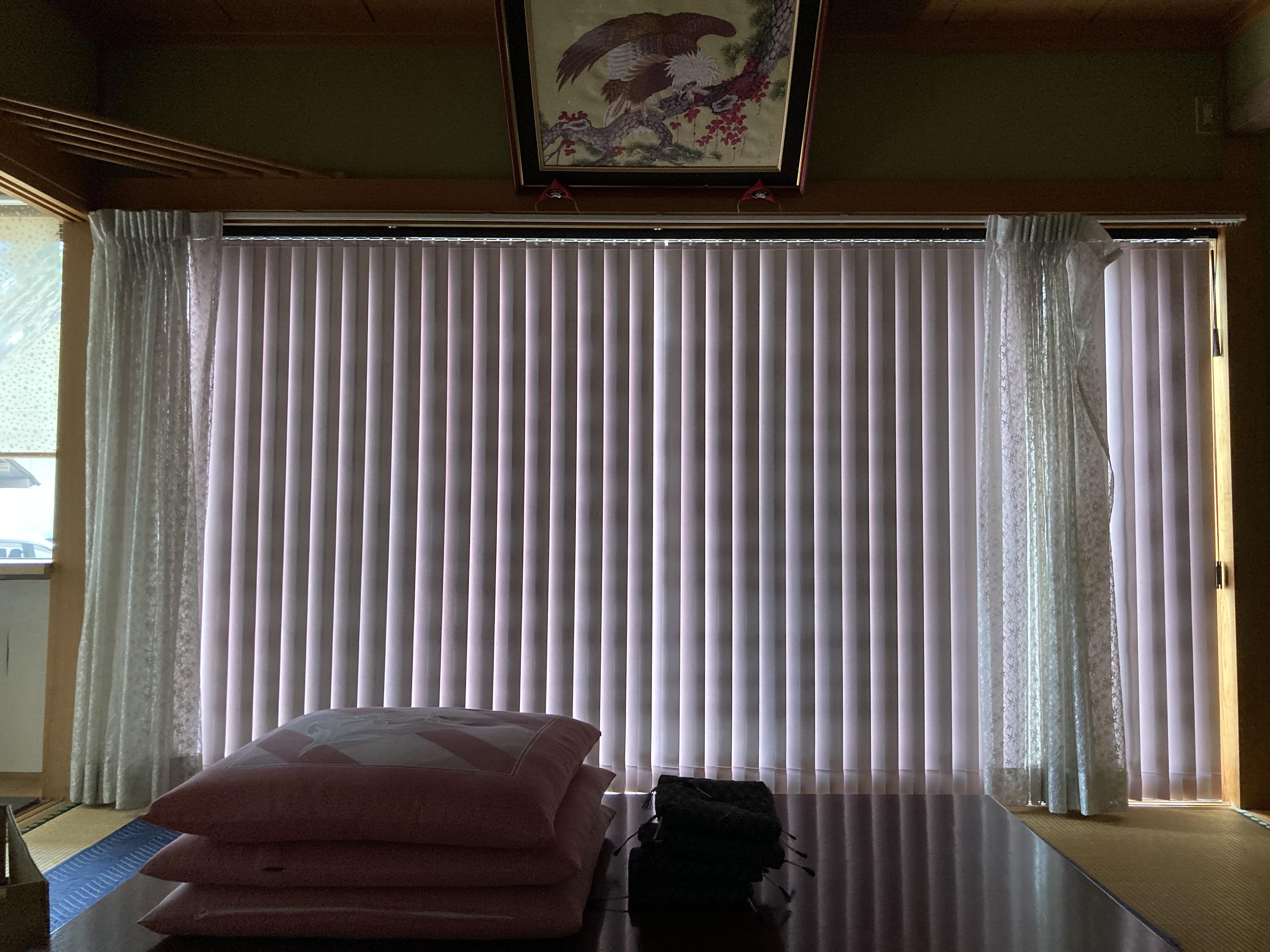 和室の昔ながらの障子戸を外し、タテブラインドを取付け、和モダンな空間を作りました。 風が吹くたびに揺れる生地は、色々な表情で見ていて心地いいです。 柔らかいピンク色がこちらのお宅の奥様のイメージにピッタリ!。 とても素敵に仕上がりました。