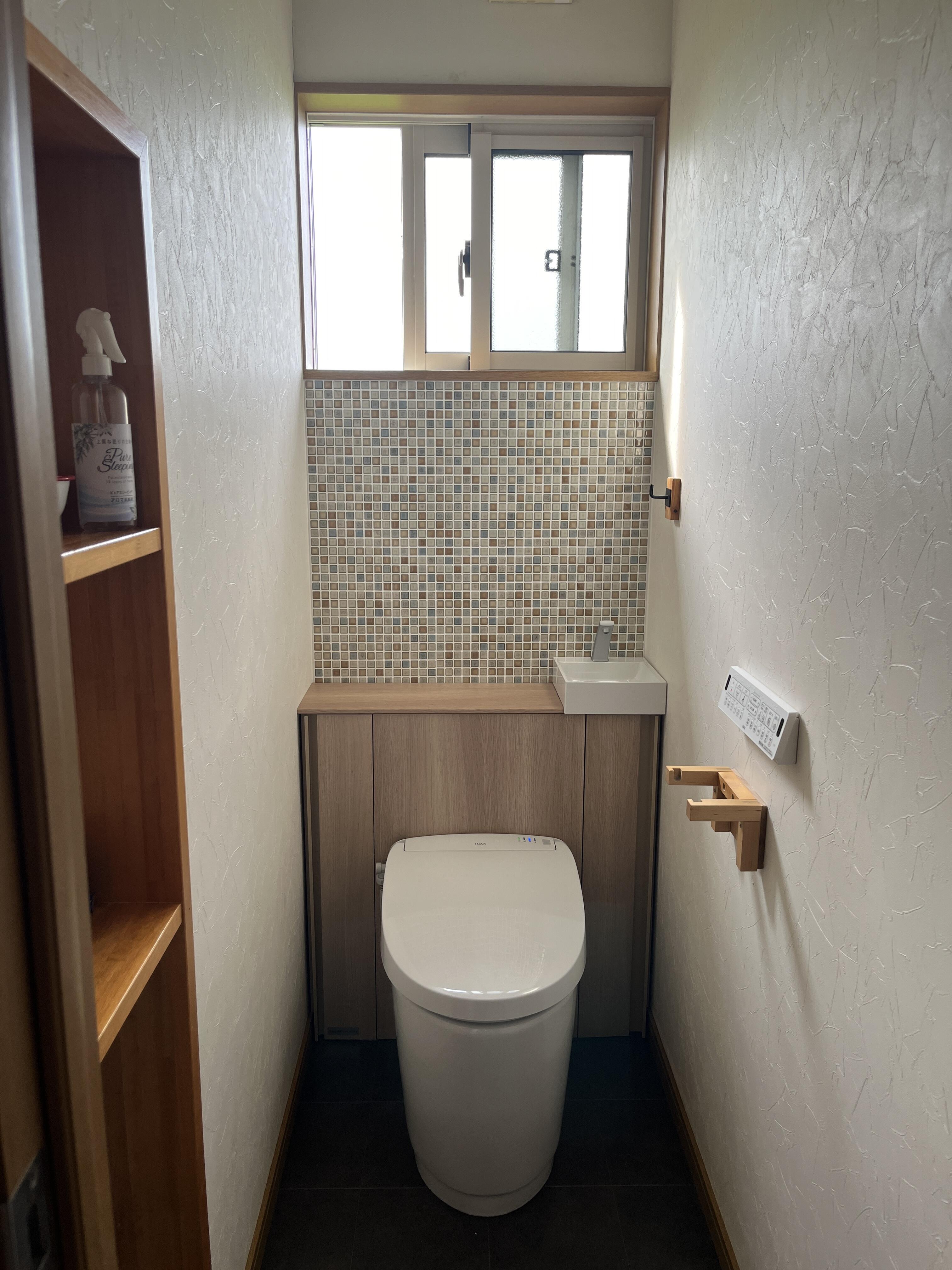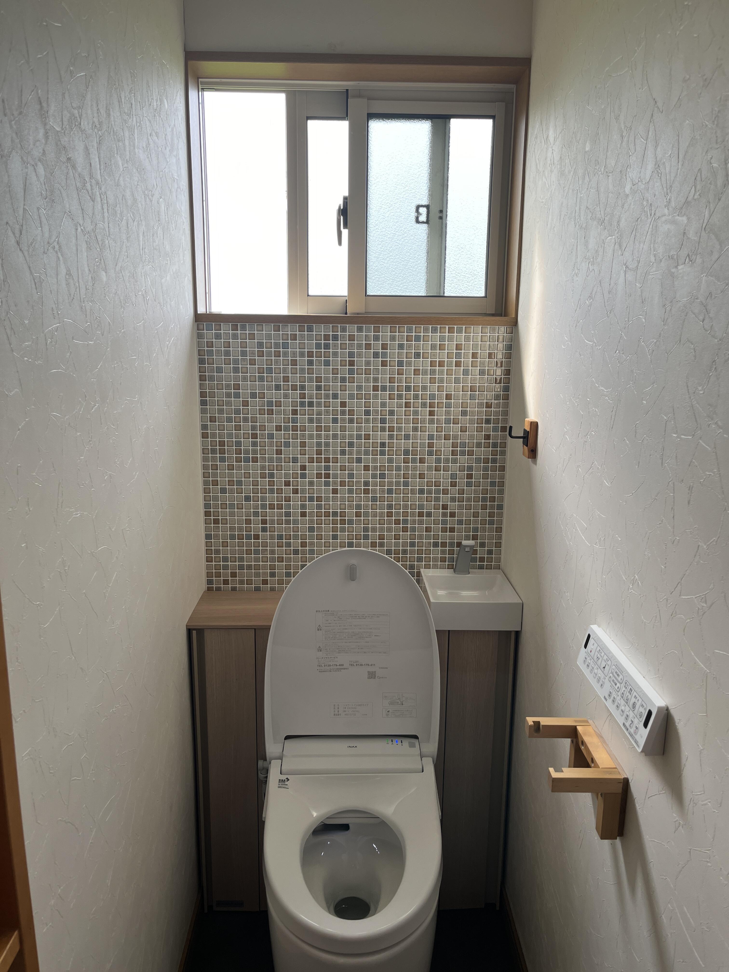トイレを壁面収納付きのJフィットトイレに入替させて頂きました。 節水トイレと内窓の設置で補助金の申請も完了しました。 床の貼替と窓下のモザイクシートも素敵なアクセントになりました。