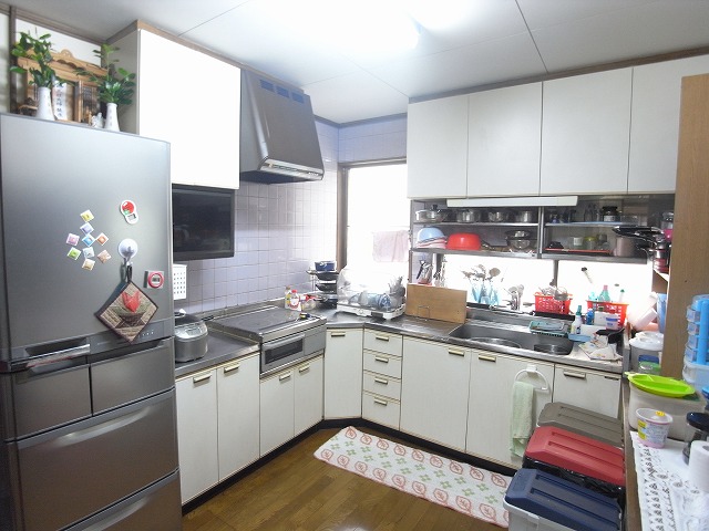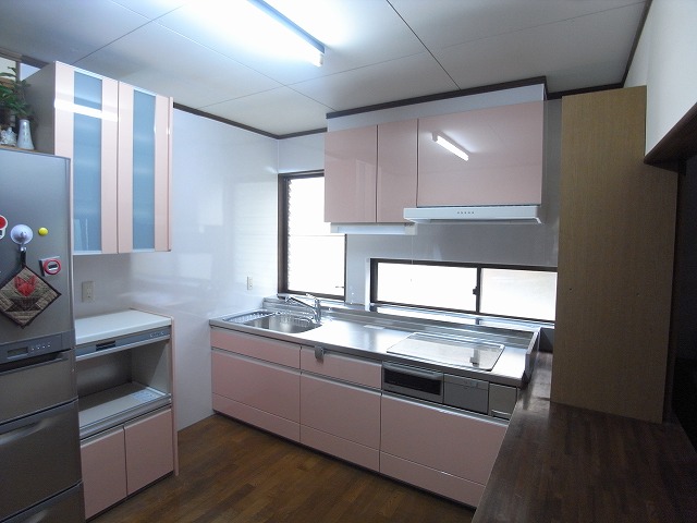築20年のキッチンを蛇口が壊れた事がきっかけで思い切って取替えられました。取替前のキッチンはL型でとても使い勝手(レンジフードがとても高い位置にあり、スイッチを押すのも大変で、菜箸で押されていたそうです。)が悪いとの事でレイアウトを大幅に変更しⅠ型にしました。レンジフードはお掃除のしやすいラクリーンフードを採用お客様が身長が低い方でしたので、通常の位置より下に下げました。使い勝手も良くなって、とても喜んで頂けました。