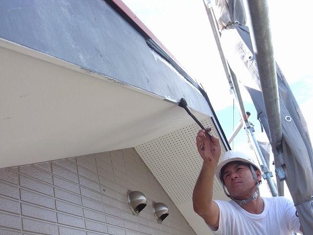 シーラーを塗った後、軒天を塗ります。壁を仕上げた後塗ってしまうと壁を汚してしまう可能性があるからです。