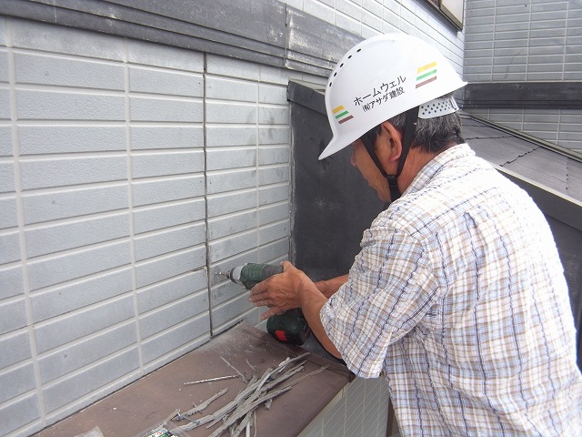 釘が抜けている所や壁が浮いている所にビスを打っていきます。次に劣化したコーキングを剥ぎ取っていきます。