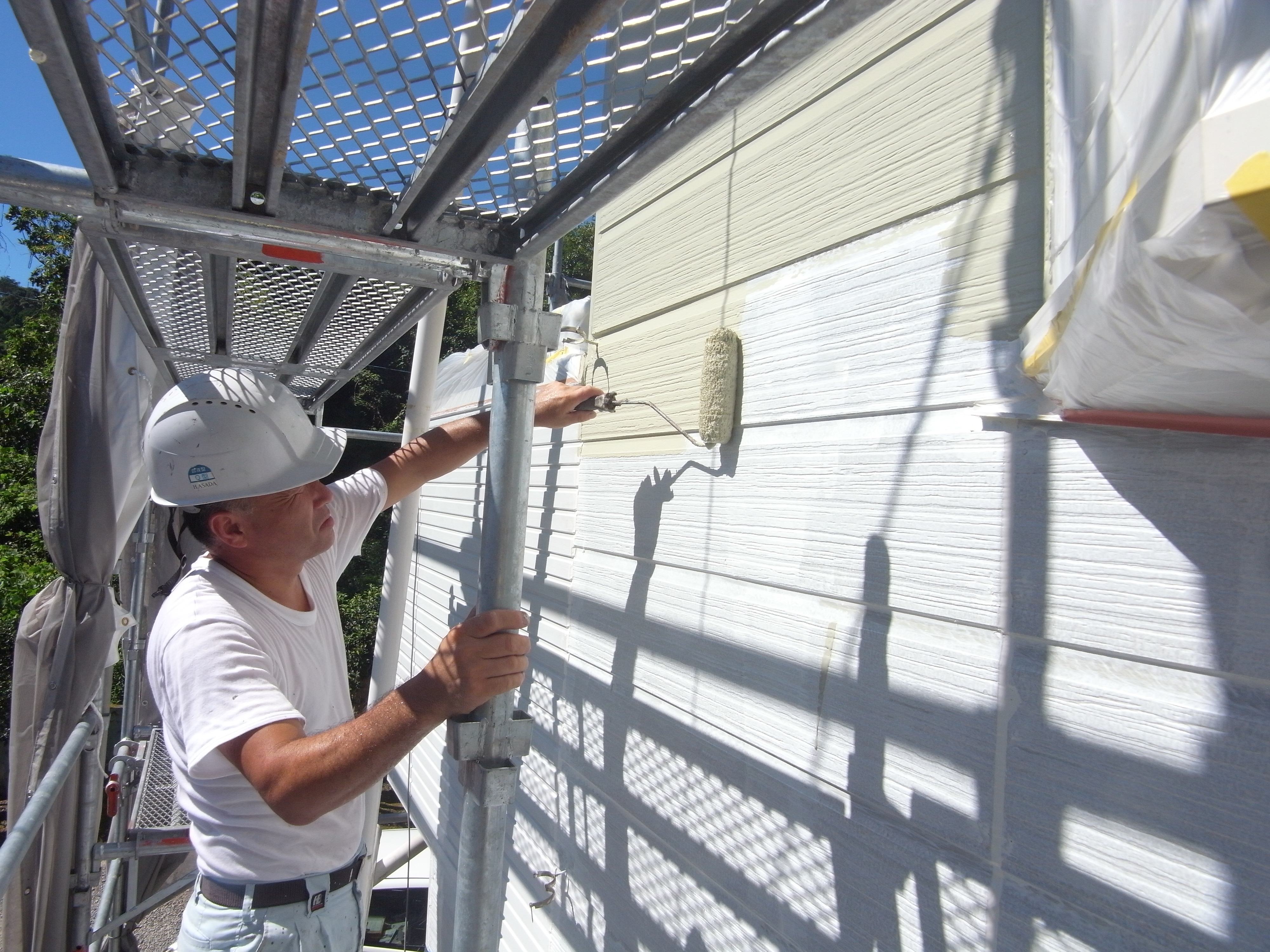 高圧洗浄、コーキング処理をした後に下塗りを行っています。ローラーで付きにくい所を先にハケで塗っています。下塗りは、接着剤のような役割なので、しっかり塗ります。