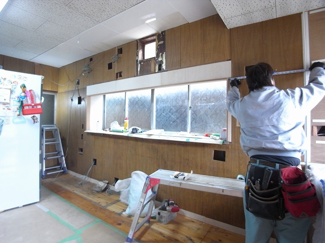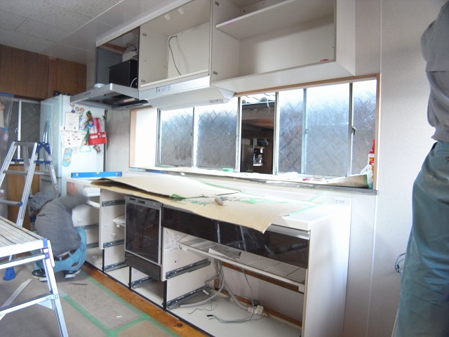 壁に穴が開いていますが、電気配線の穴です。この後キッチンパネルを貼ってからキッチン取付けに入ります。