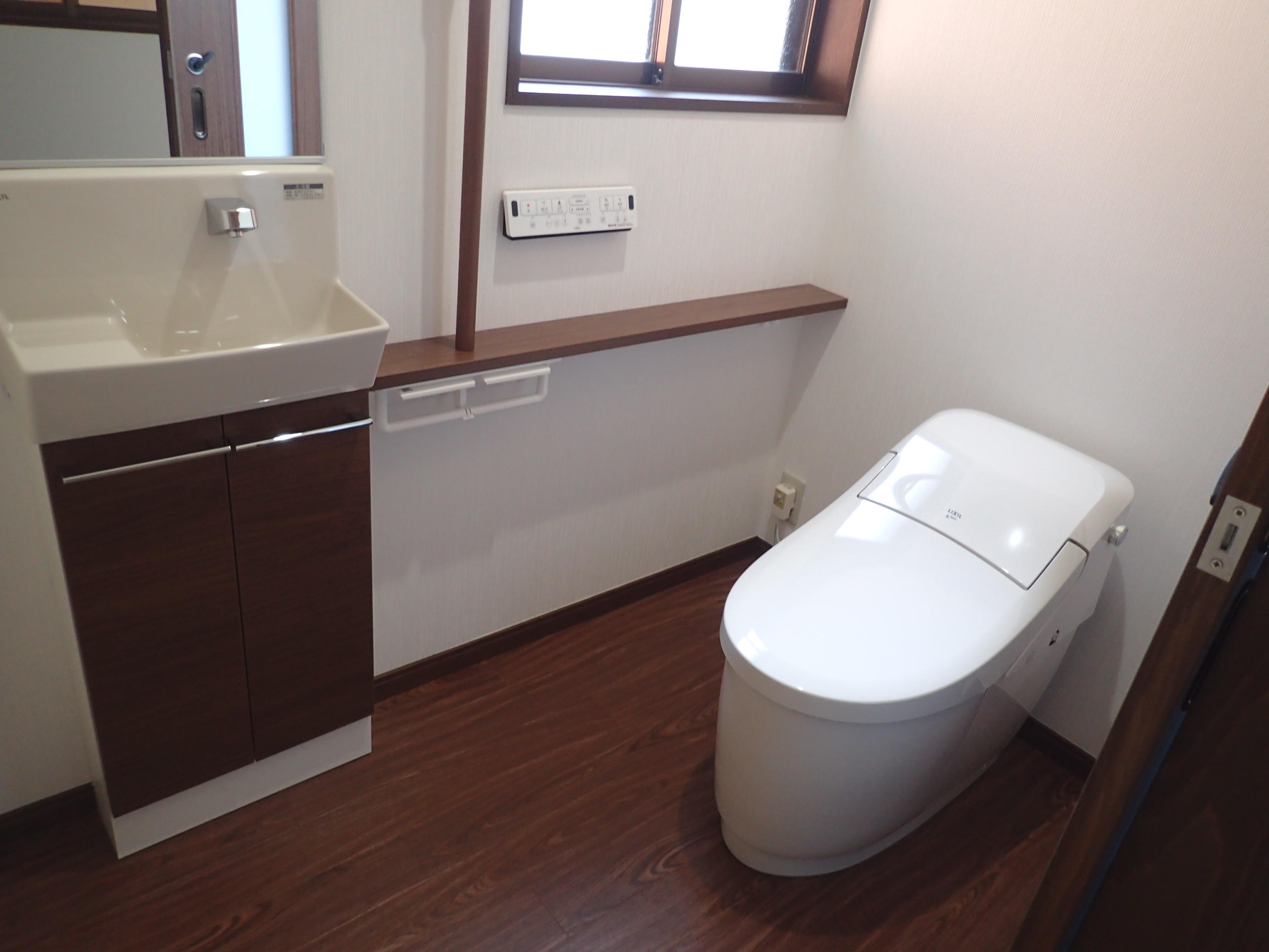 高齢化の介護対応に備えて、汲み取り式トイレから公共下水道に接続して、水洗トイレへ取替えました。壁を撤去し、間取りを変更することにより暗かった洗面台も明るくなり、とても快適な空間になりました。
