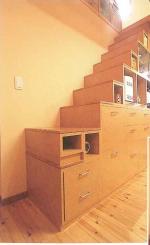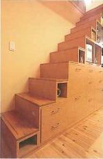 ★塔屋への階段は造り付けの収納家具に。1段目は可動式にして、子どもたちが上がれないようになっています。