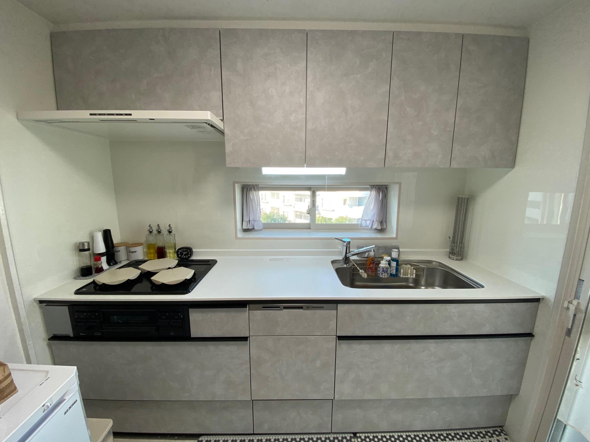 既存のタイル壁も上からキッチンパネルで施工し