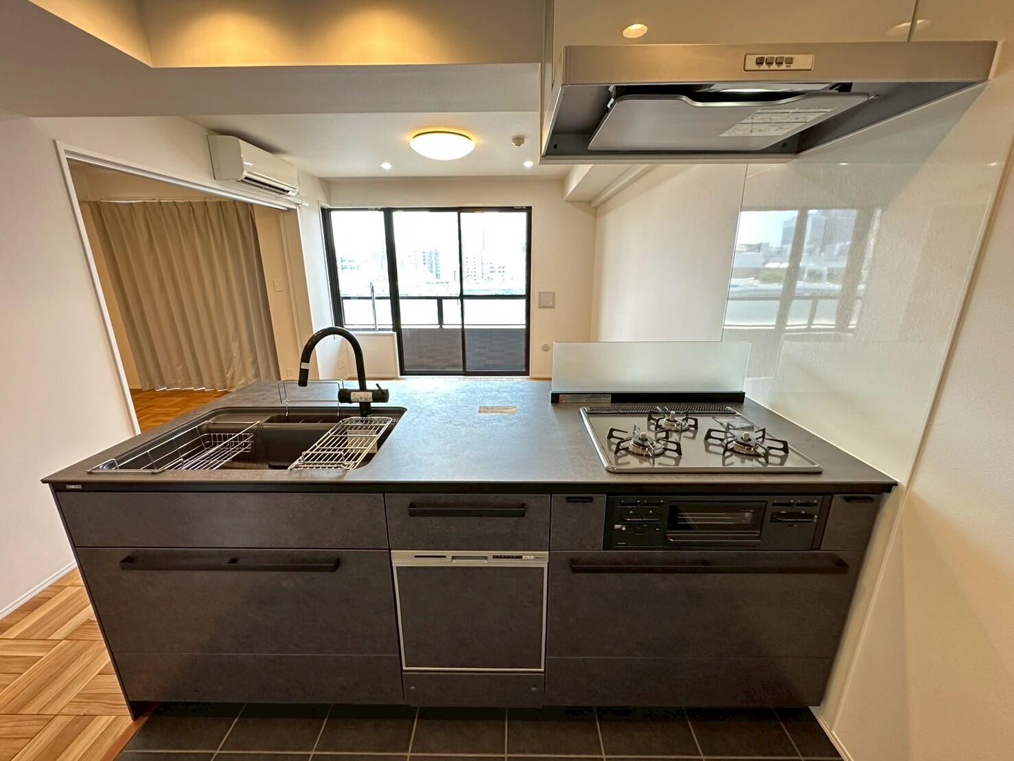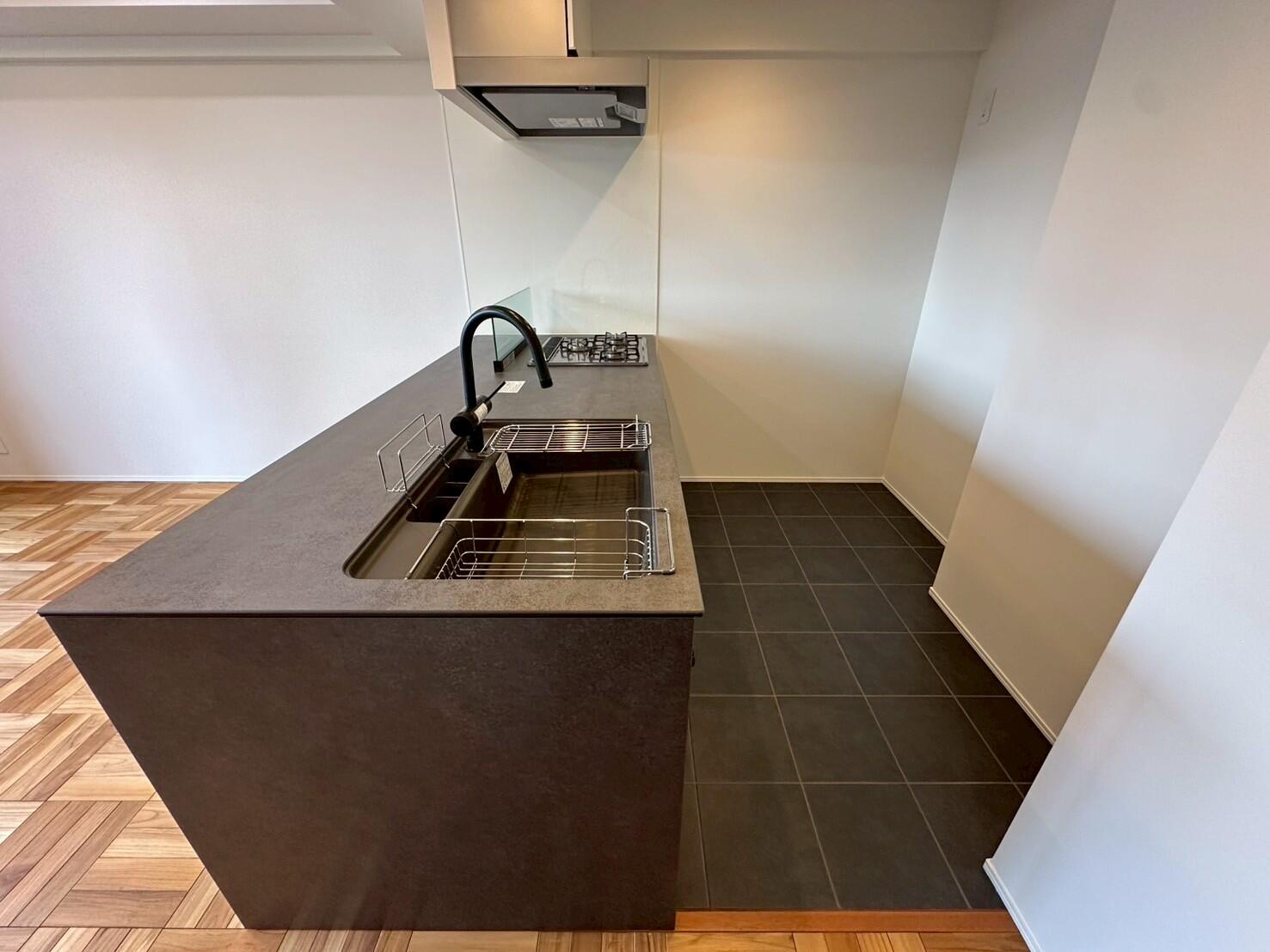 また、キッチンの床材はタイル貼りにし