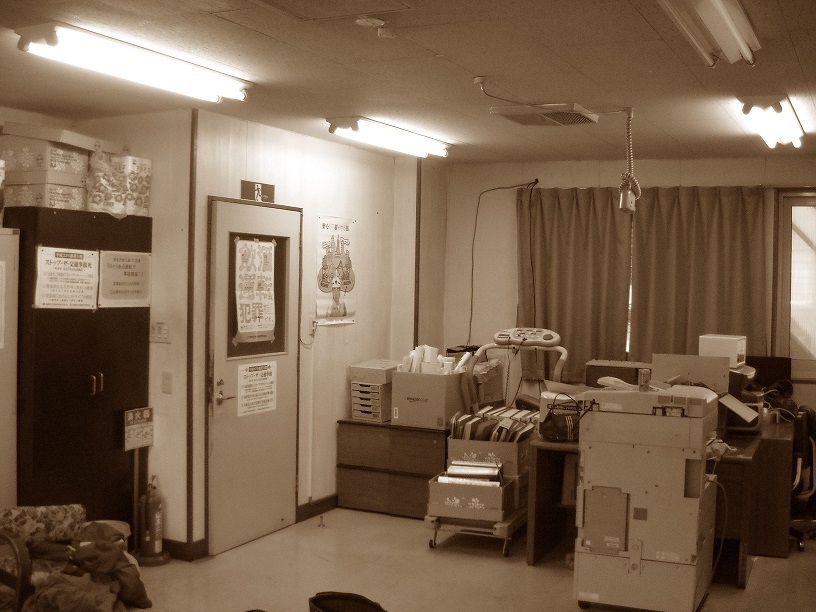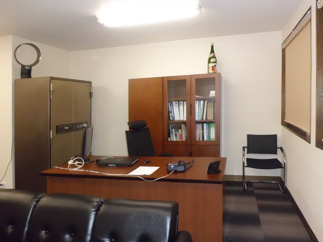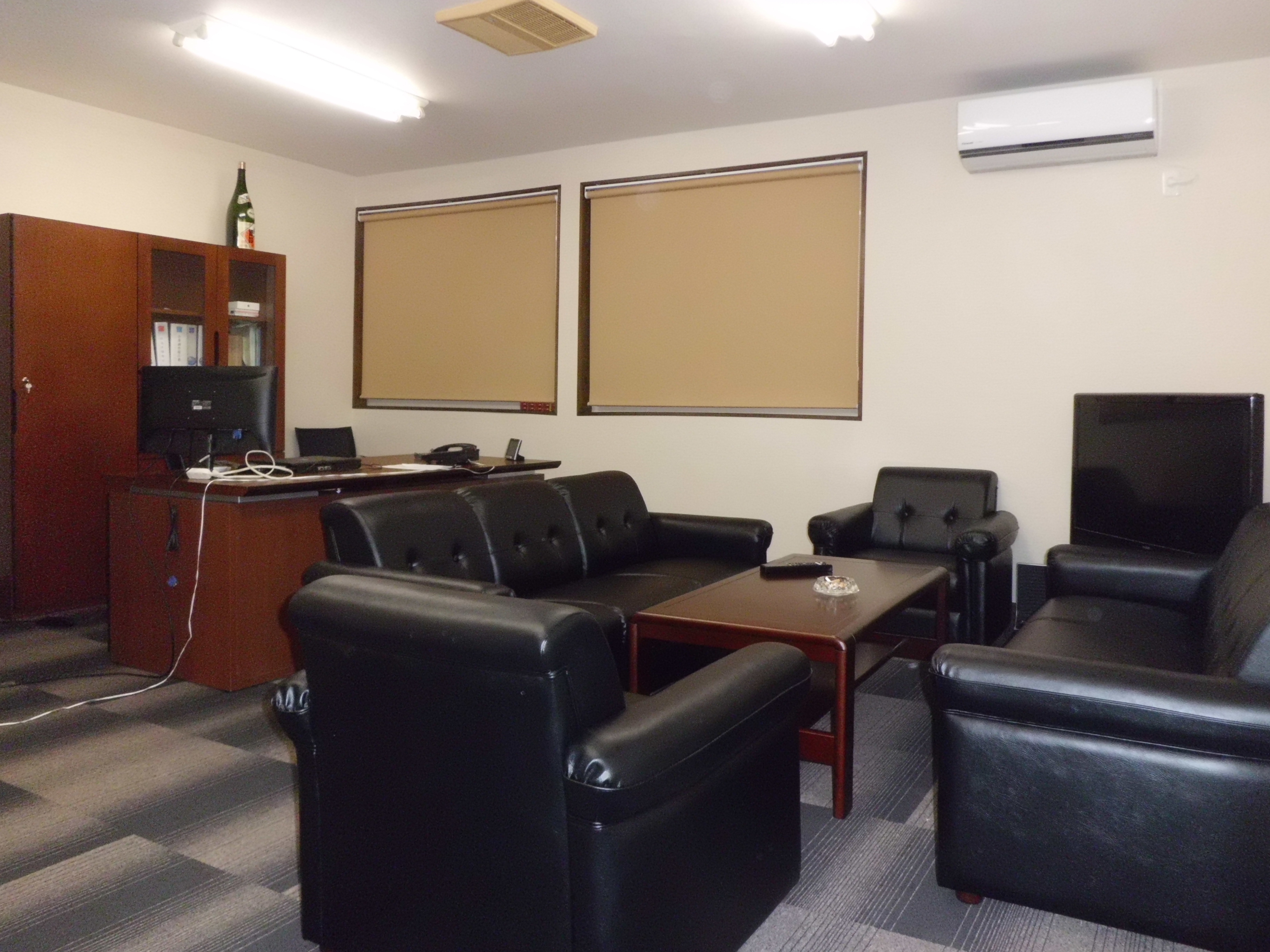 長年おつき合いさせていただいております業者さまの旧事務室あとを、社長室に大改修いたしました。輸入品だという高級な応接セットがマッチするシックでモダンな仕上がりに。業務用冷蔵庫のような立派な”金庫”が印象的です!!
