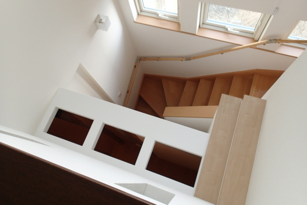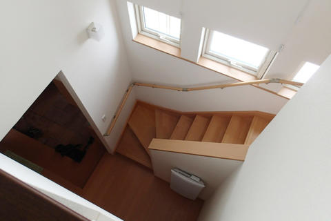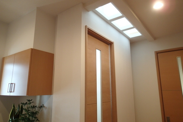 階段室出入り口に扉を設け、明かり採りを設置しました。また、2階シャワールームからバスルームへの変更。寝室などクロスも貼り替えデザインリフォーム。