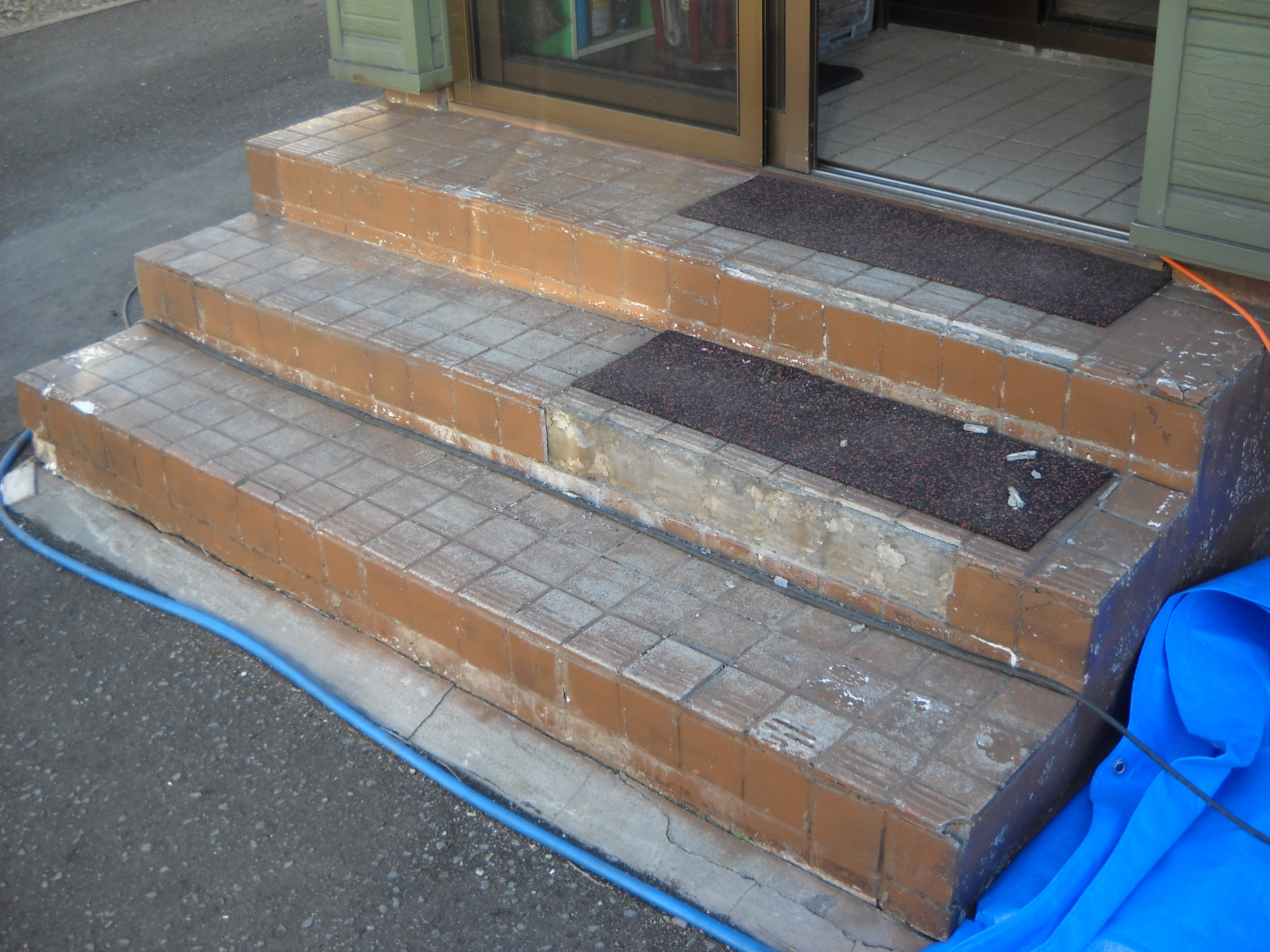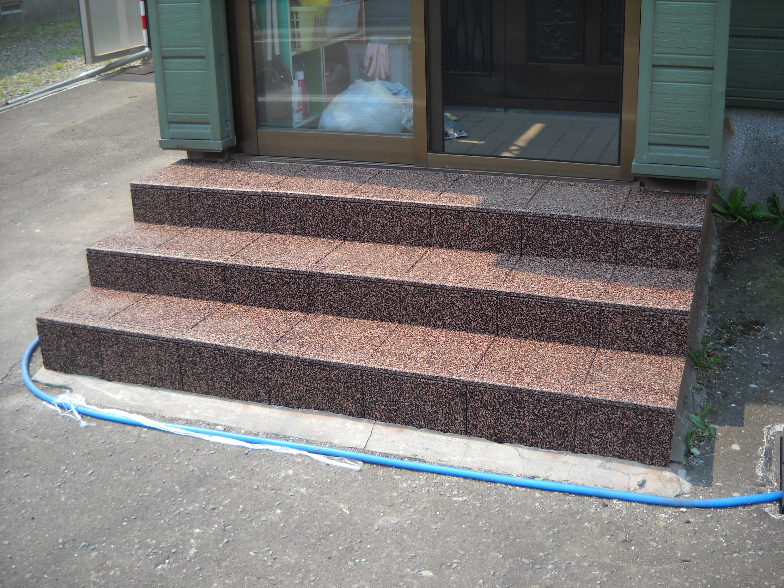 ポーチ修繕工事 タイルがはがれ古かった階段を、ゴムチップパネルを貼り新しくしました。ふんわり足元が優しい感触で、雨の日の滑り止めにもなります。