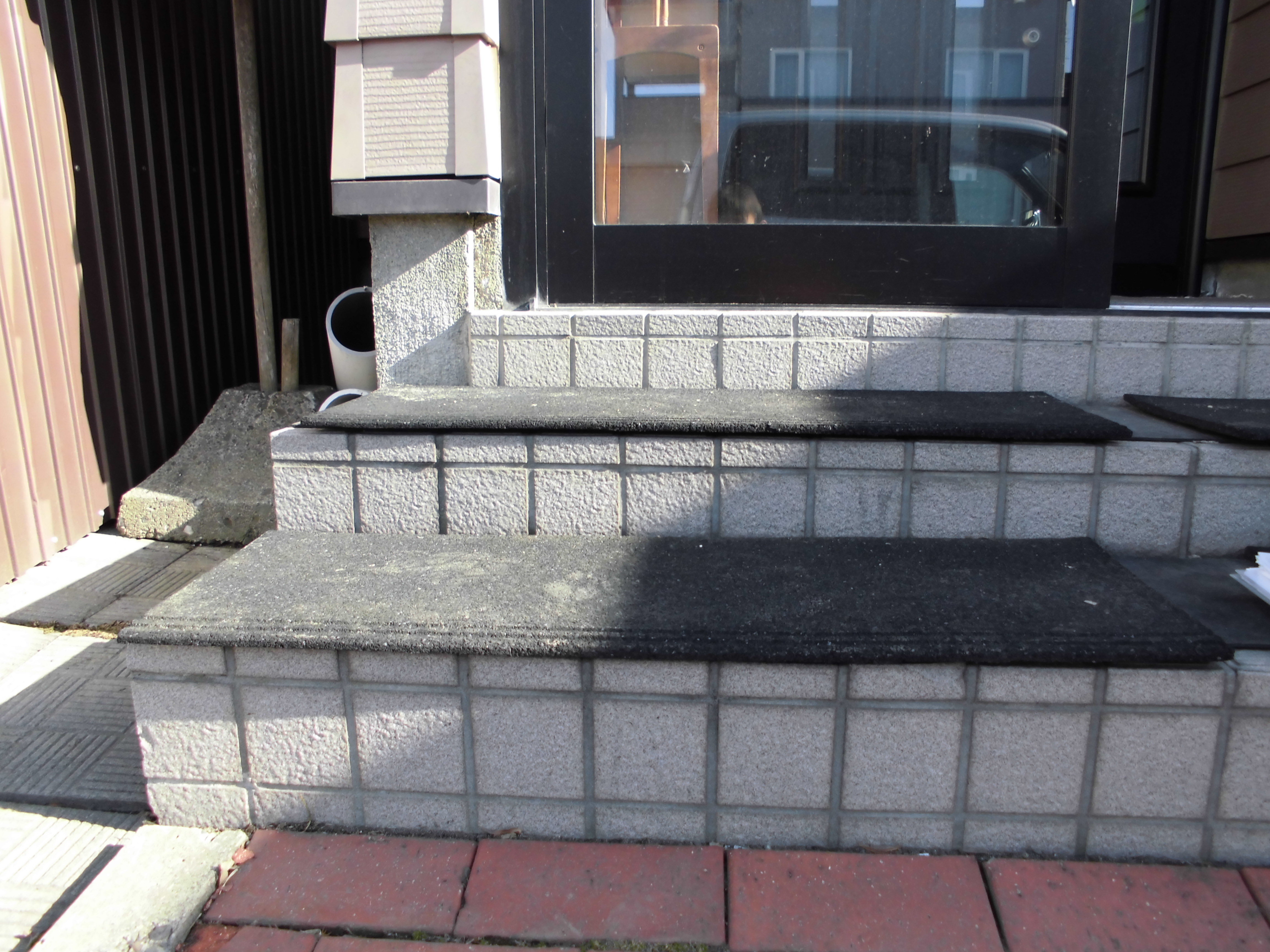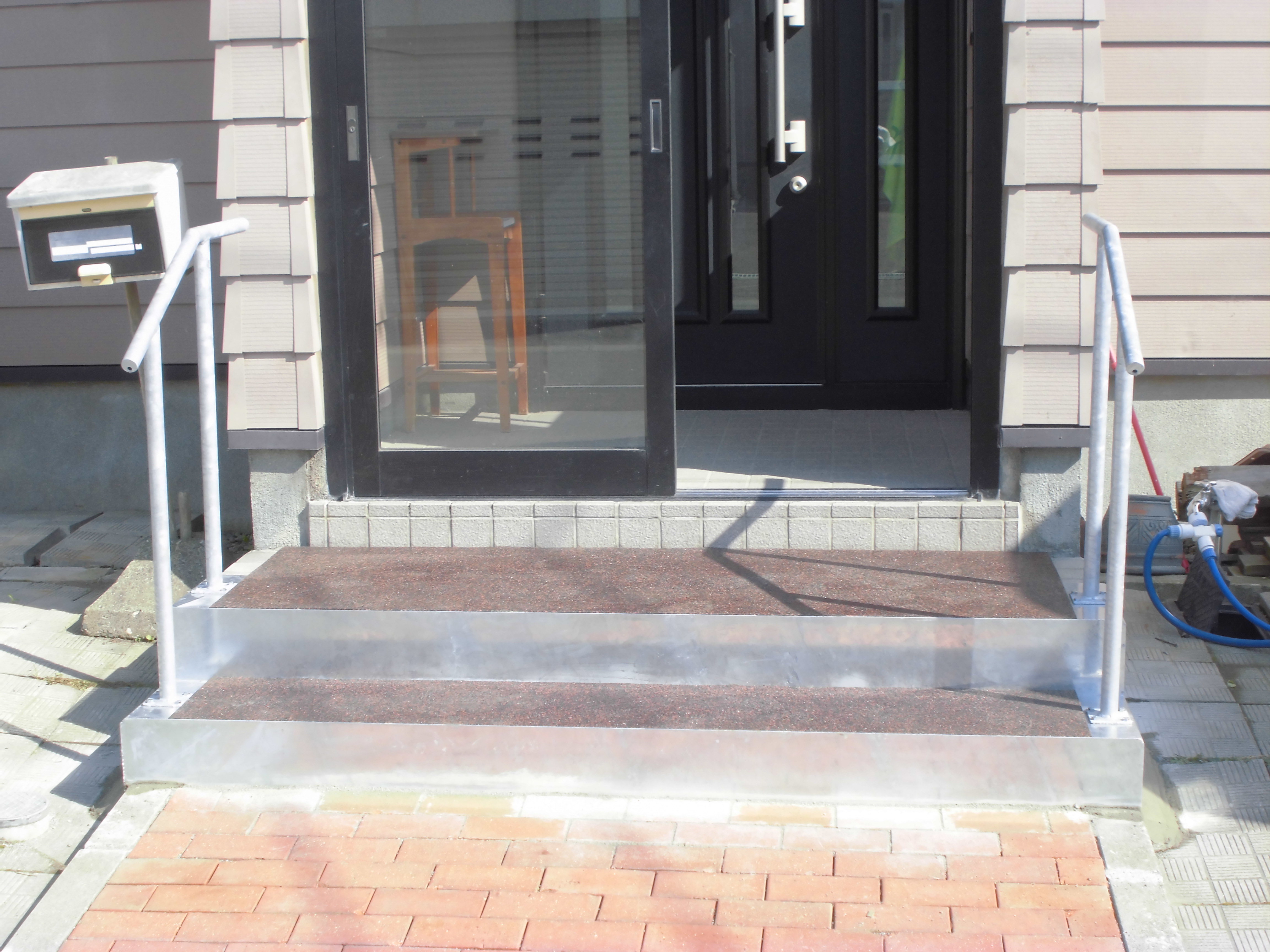 手摺を設置して、段差の高さも低くし緩い勾配に。ゴムマットもキレイになりました。