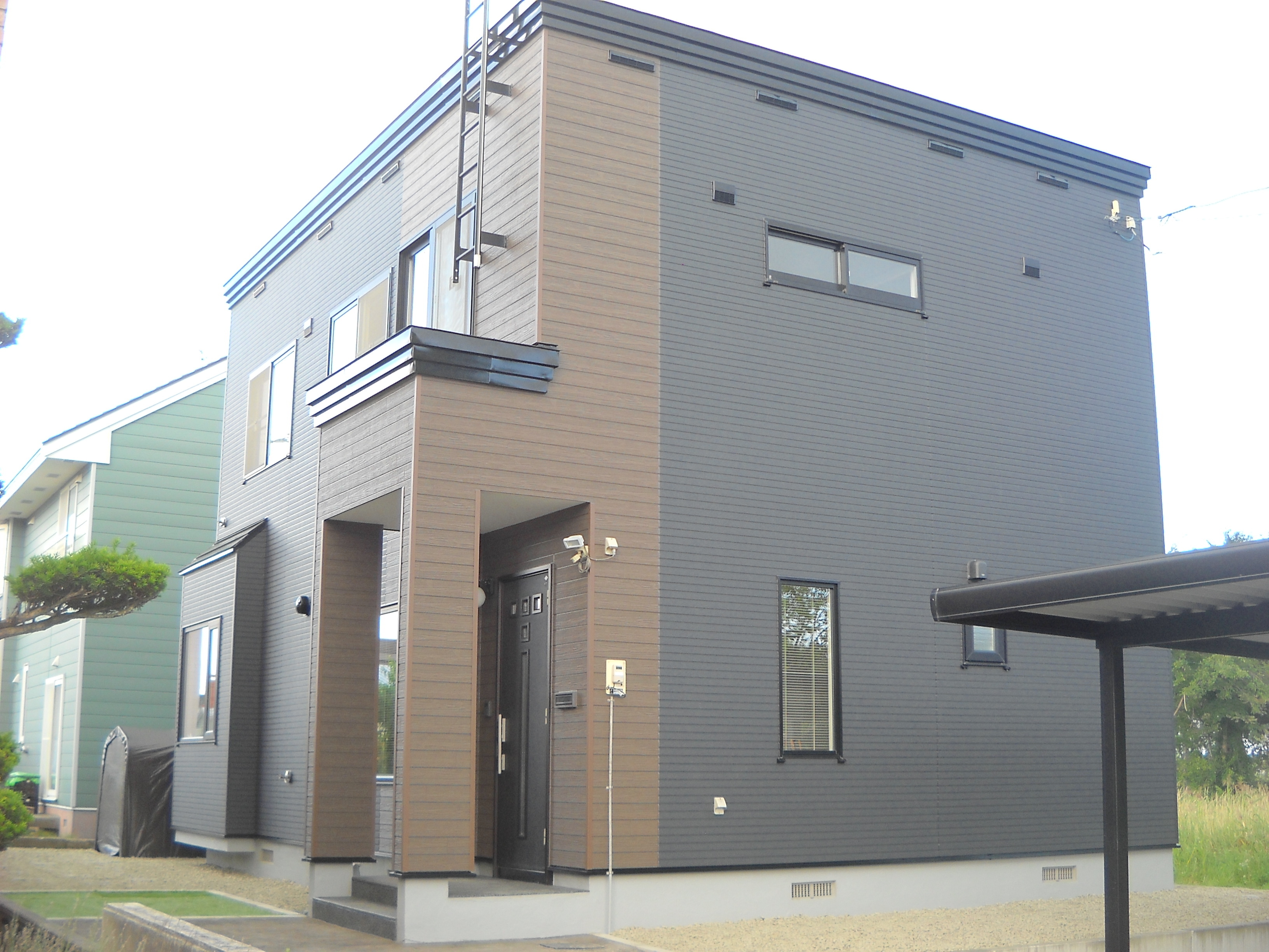外壁張替、屋根塗装他工事。外壁は、ブラウン色で統一し部分的に貼り分けしました。とても落ち着きのあるモダンな佇まいに。