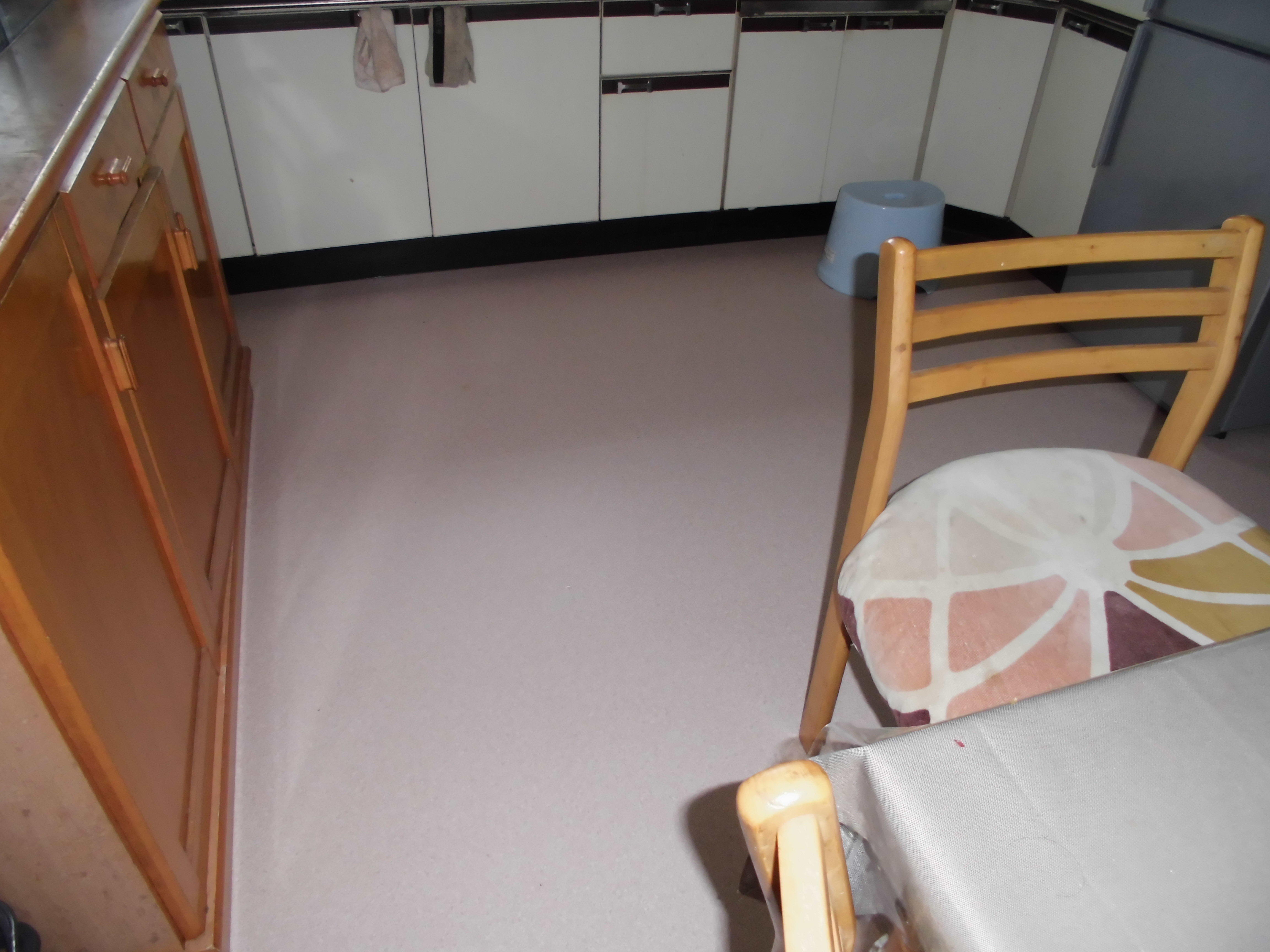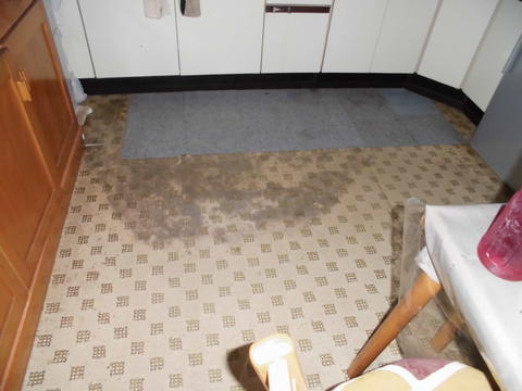 キッチンの床、クッションフロアの汚れがひどく、取替しました!ピカピカに。